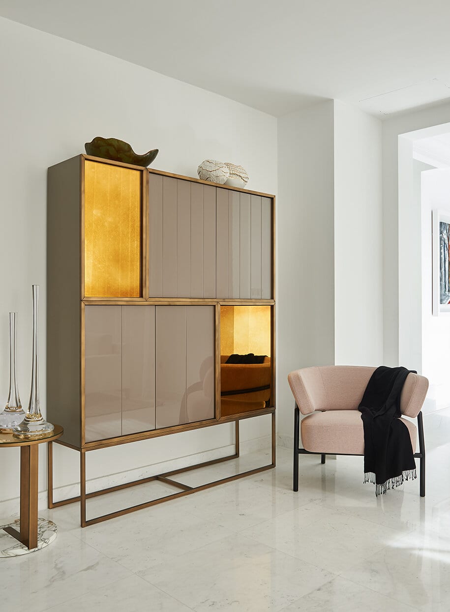 The final note comes from Kenya Black marble, bringing depth and contrast without breaking the calm. Different textiles add texture and variation, while bronzed brass introduces a quiet metallic effect. It’s a balanced mix: soft against solid, matte against a muted sheen. And in the end, the residence feels cohesive, with details that hold up the longer one looks.
