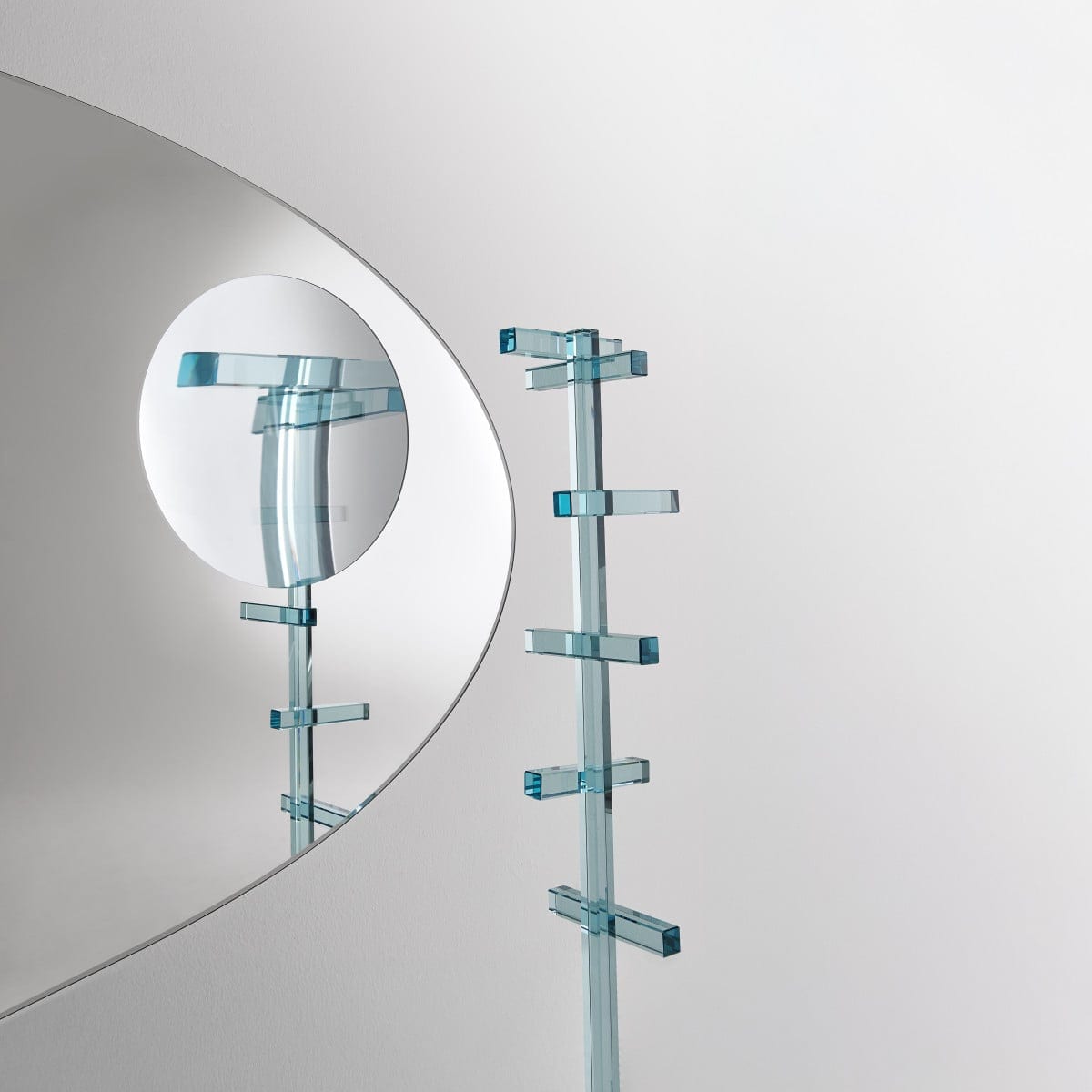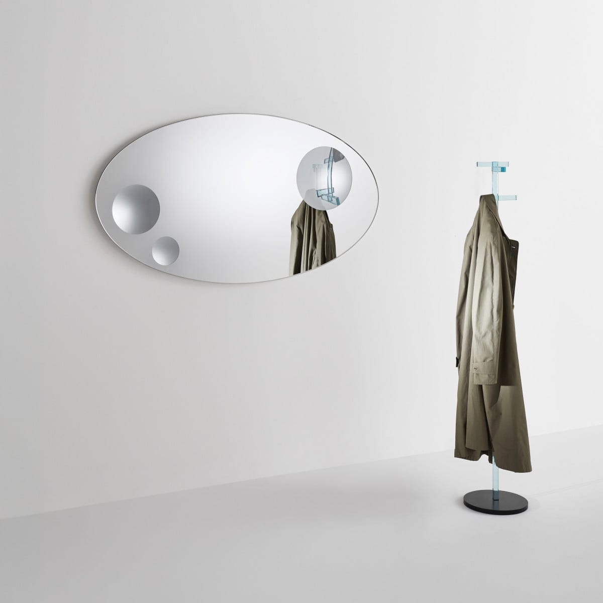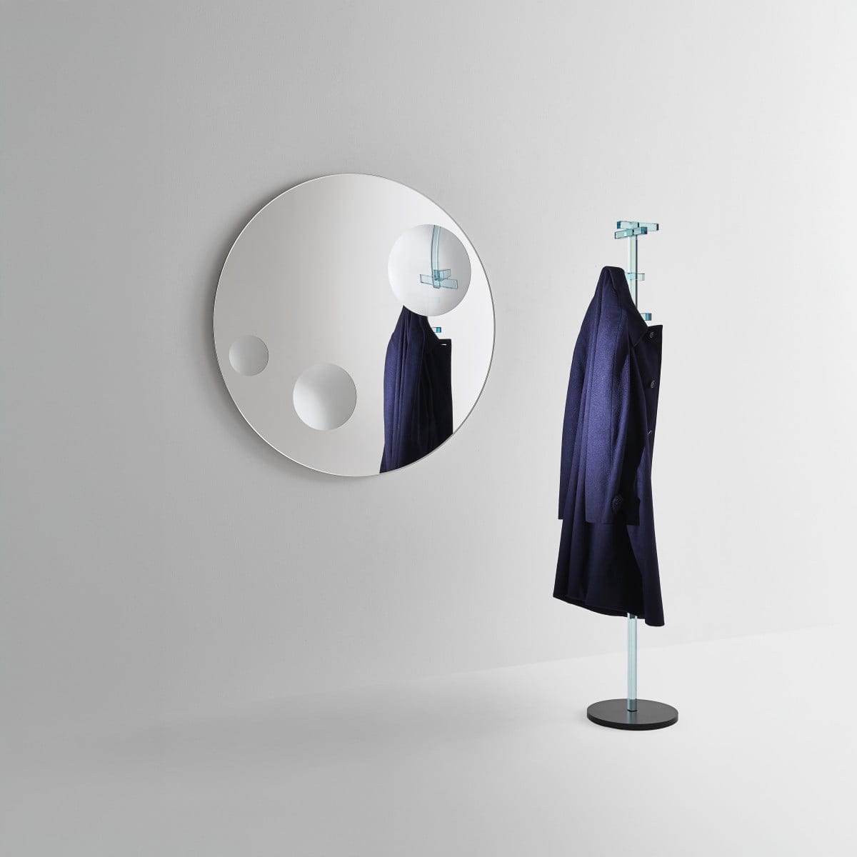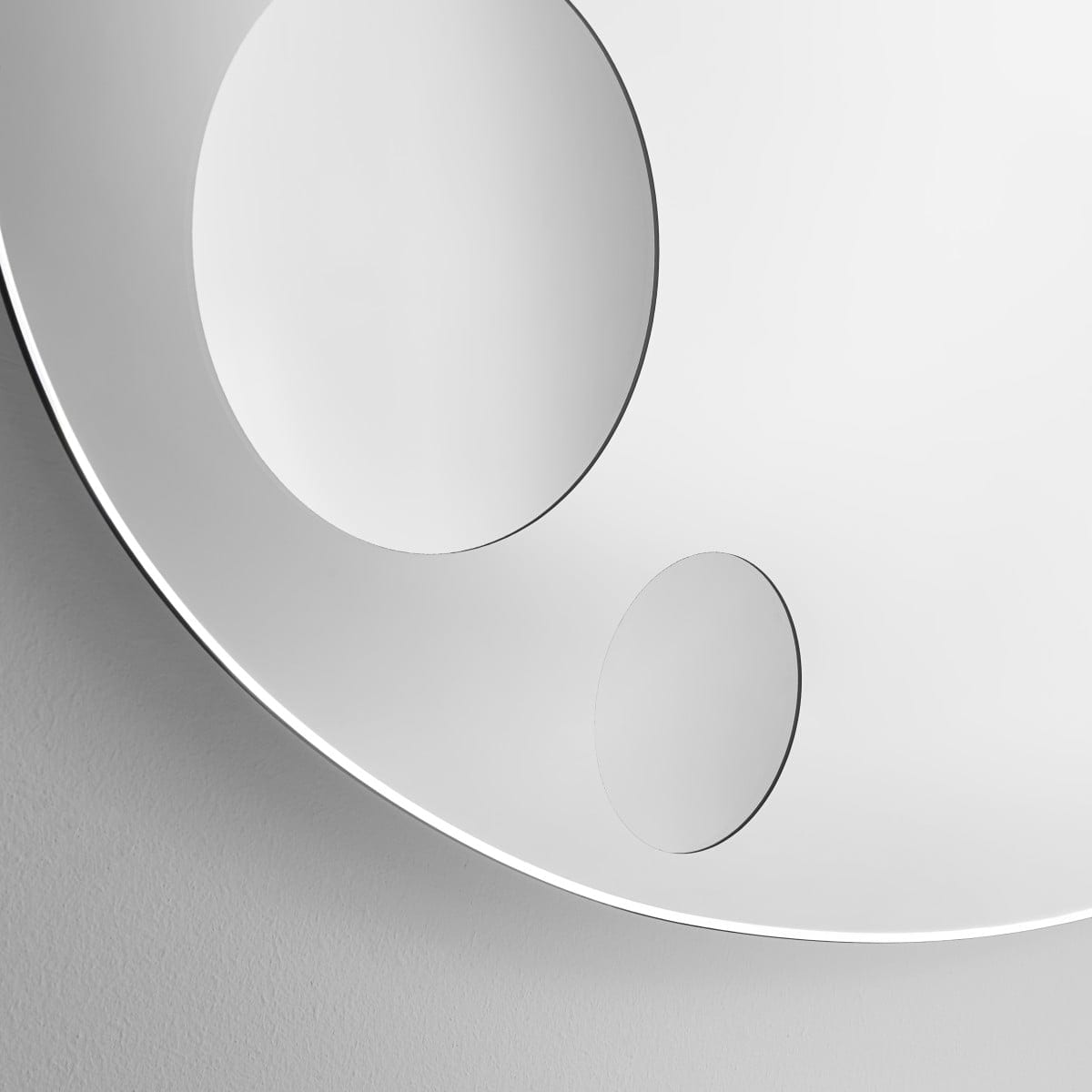 Celeste is a mirror that plays with perception without trying too hard. Designed by Piero Lissoni for Glas Italia, it starts with a clean round or oval silhouette, then breaks the calm with three magnifying portholes set on the surface. Each porthole has its own diameter and its own level of magnification, so the reflection shifts as someone moves past it. And that slight distortion is the point: a magnetic, almost surreal effect that feels deliberate, not decorative.
