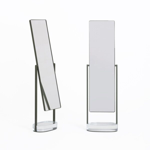 Contro Peso is a floor mirror with a clear point of view: two reflective faces, set on a precise steel frame, with a stance that feels architectural without getting heavy. It tilts, it regulates, and it keeps the lines clean. The proportions stay narrow and tall, so it reads as a piece of furniture, not just a utility.