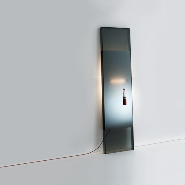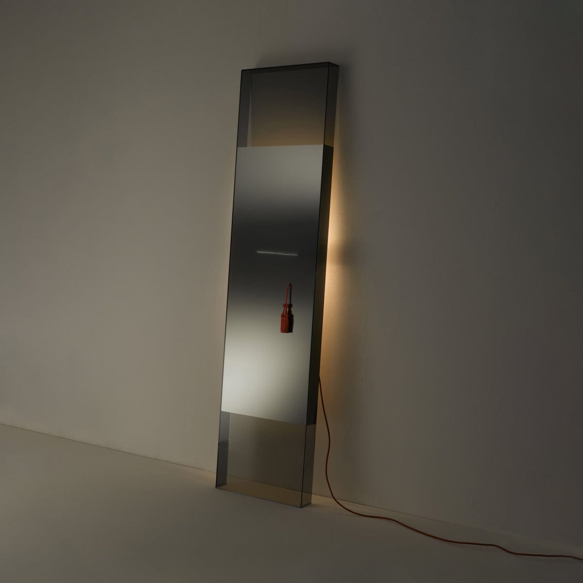 The most distinctive detail is what happens when the lamp on the backside is on. Through the central mirrored section, the luminous trace of that lamp becomes visible, a controlled glow that shows itself as a line of light rather than a full exposed source.