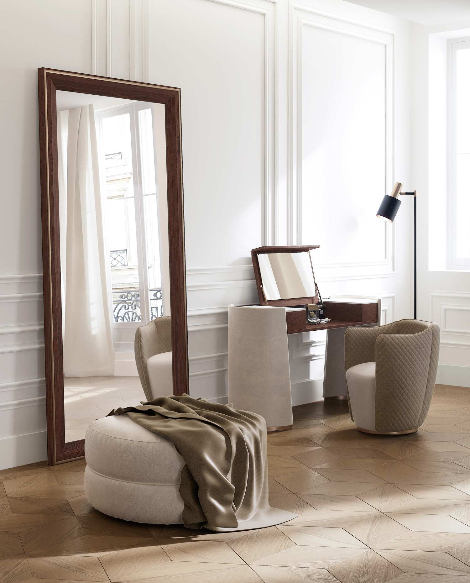 It is a piece that suits spaces where every object has a clear role: reflecting light, opening up sightlines, and framing the person in front of it.