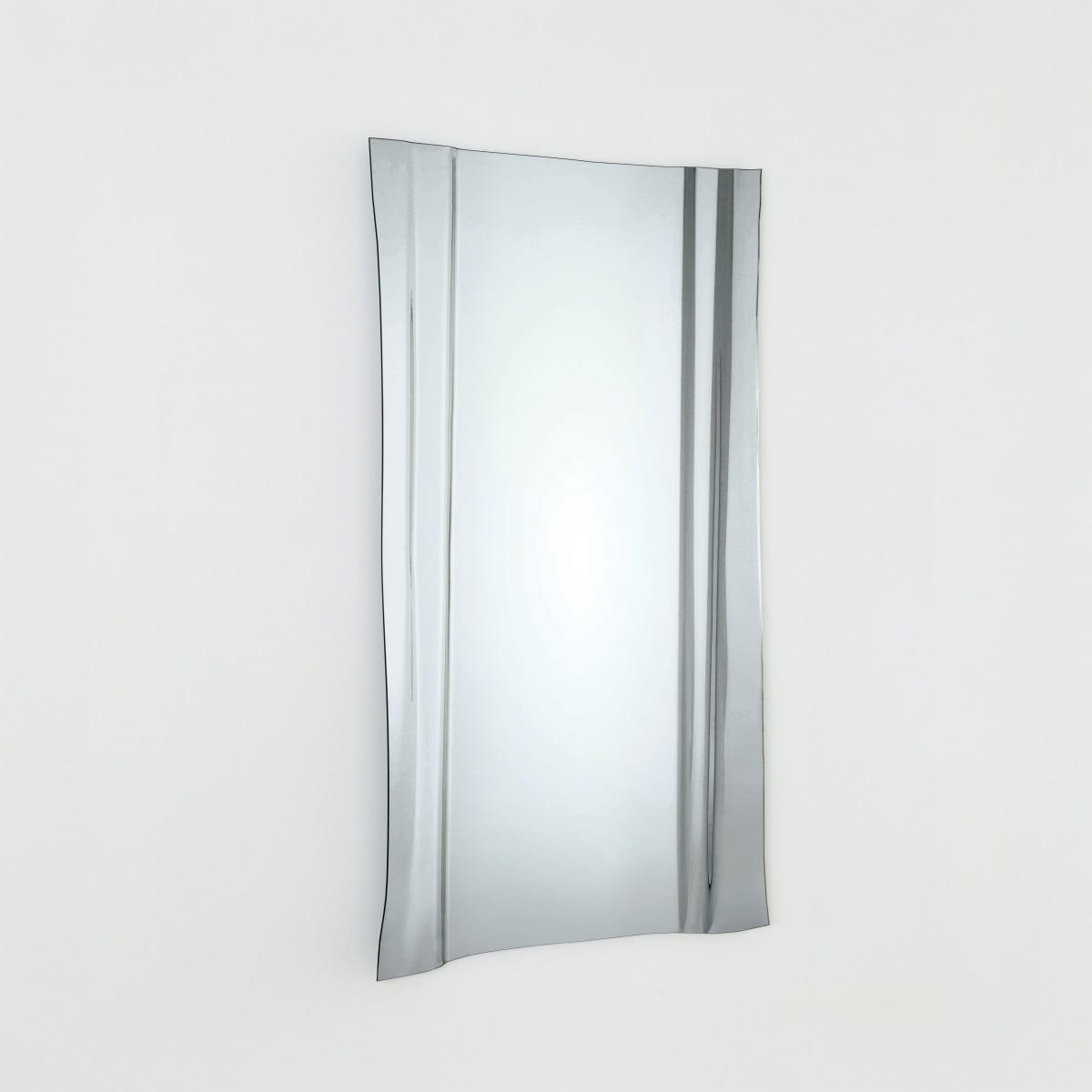 Maestrale takes a familiar object and gives it a small twist that changes everything. The mirror is cut from a single sheet of glass, then gently undulated at both ends so the reflection starts to move. It reads like fabric caught by a breeze, or water with a light ripple. But it stays controlled, not theatrical.