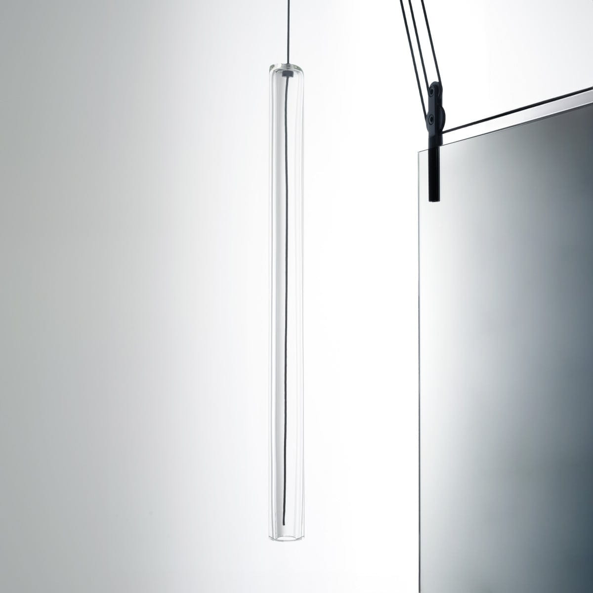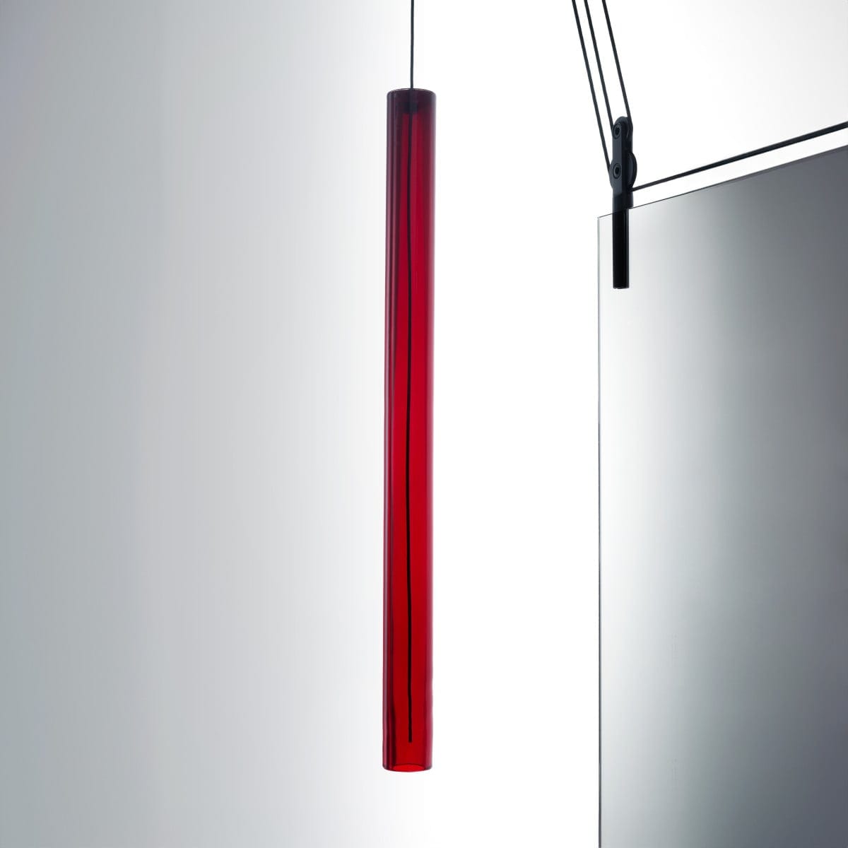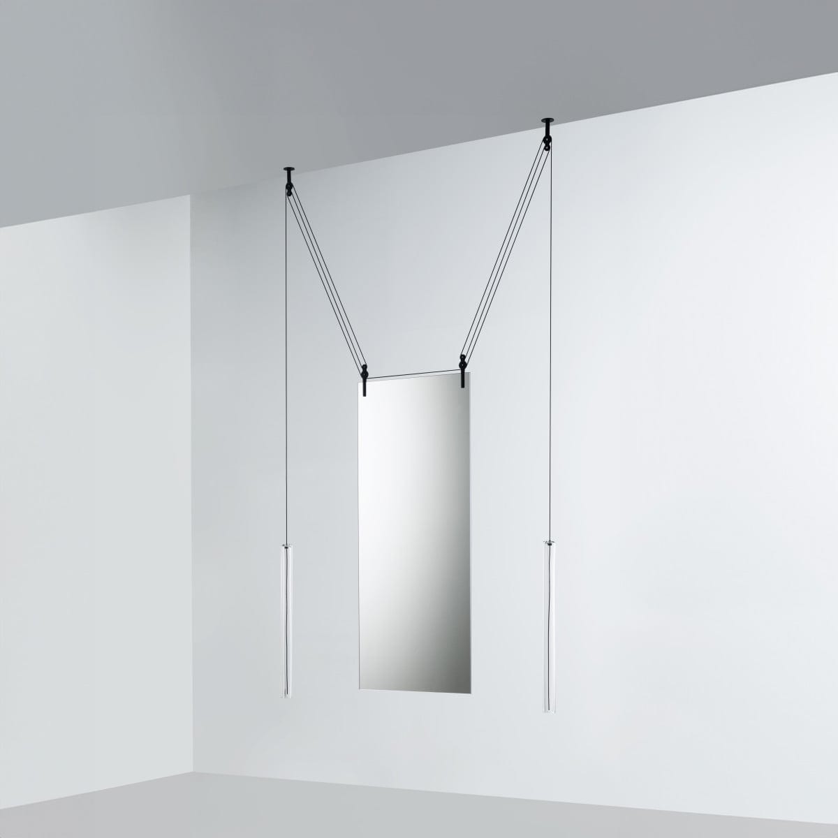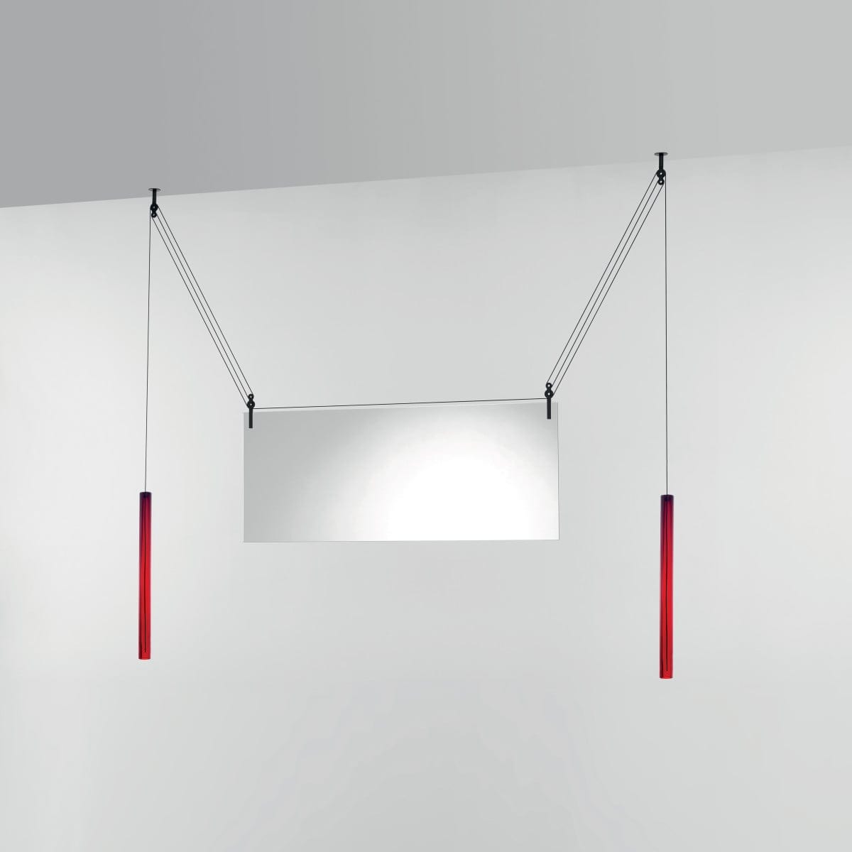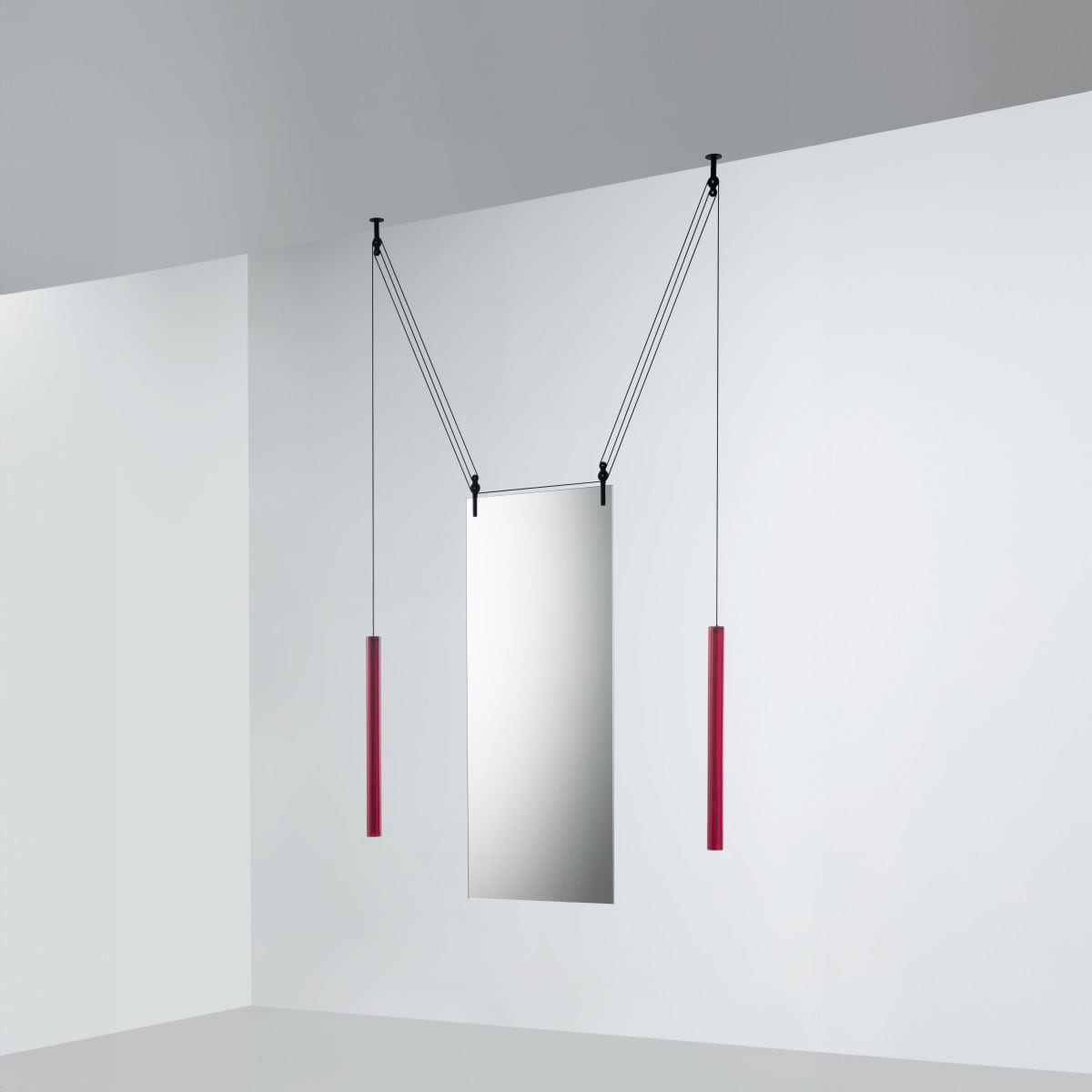 The counterweights are blown-glass cylinders, offered in red or a neutral finish. They rise and fall to balance the mirror as it moves, bringing a touch of color or restraint depending on the choice. The cables and pulleys are in black aluminum, keeping the hardware crisp and unobtrusive against most ceilings and backdrops.