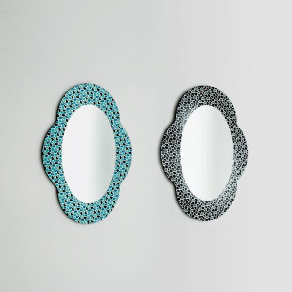 Settecento is a shaped crystal mirror designed by Alessandro Mendini. The outline is expressive without being loud, with a silhouette that feels intentionally drawn rather than simply framed. And the color work is what gives it its character: multicolored decorations that read as graphic, not fussy, bringing a controlled sense of play to the wall.