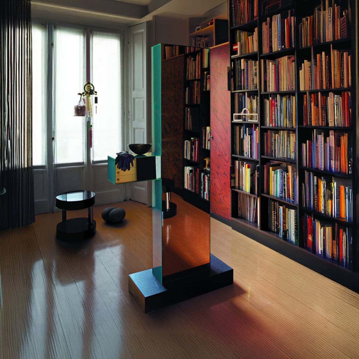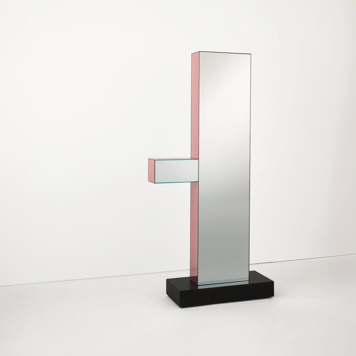 Shibam 1 is a totem mirror with a built-in object holder shelf, designed by Ettore Sottsass. The form is clean and vertical, but it never feels plain. Two front-facing surfaces are finished in white mirror, giving a crisp, clear read. Turn it slightly and the side faces introduce a different mood with decorated mirror panels, traced with thin colored engravings.