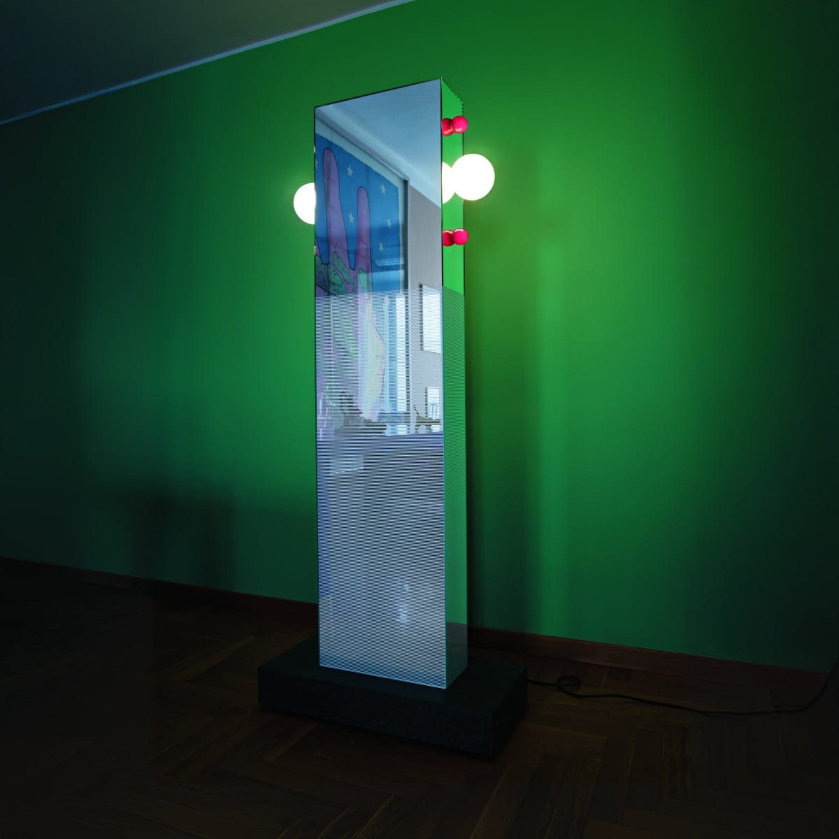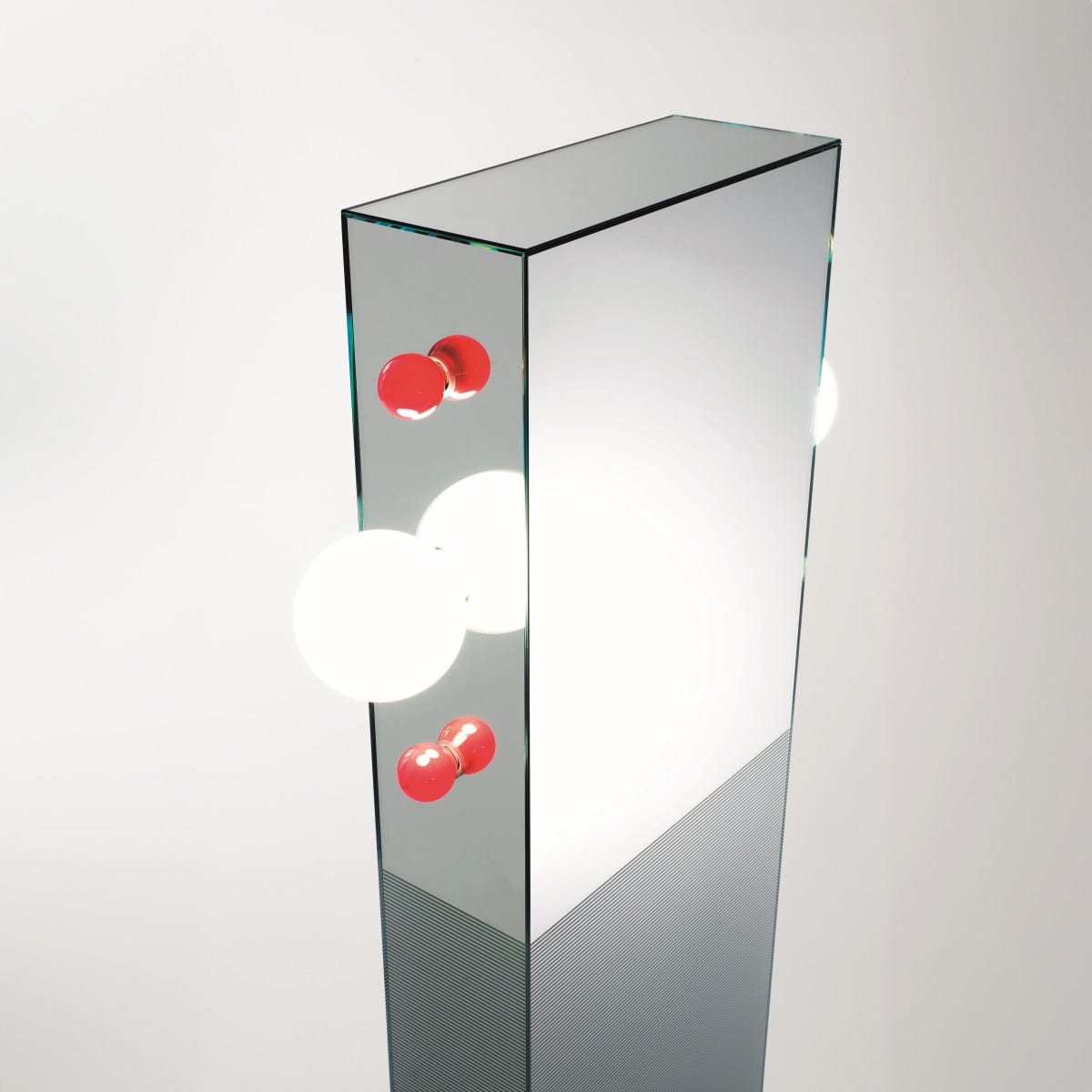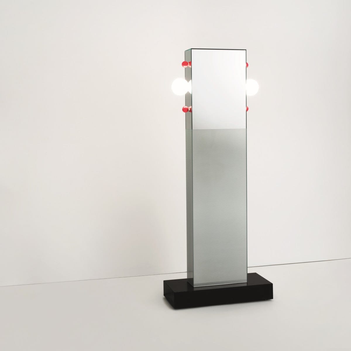 Shibam 2 reads as a totem, not just a mirror. Its proportions are tall and clean, with a strong vertical stance that feels intentional from every angle. And the lighting is part of the silhouette: red and white bulbs bring a graphic edge that’s more architectural than decorative.