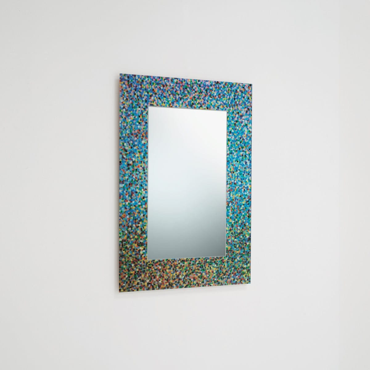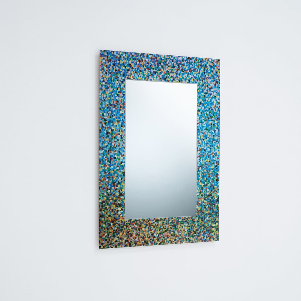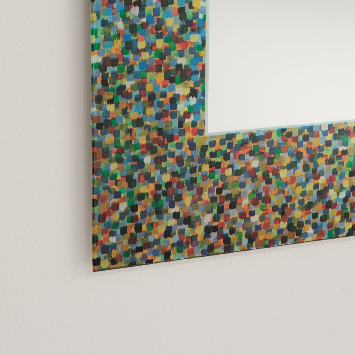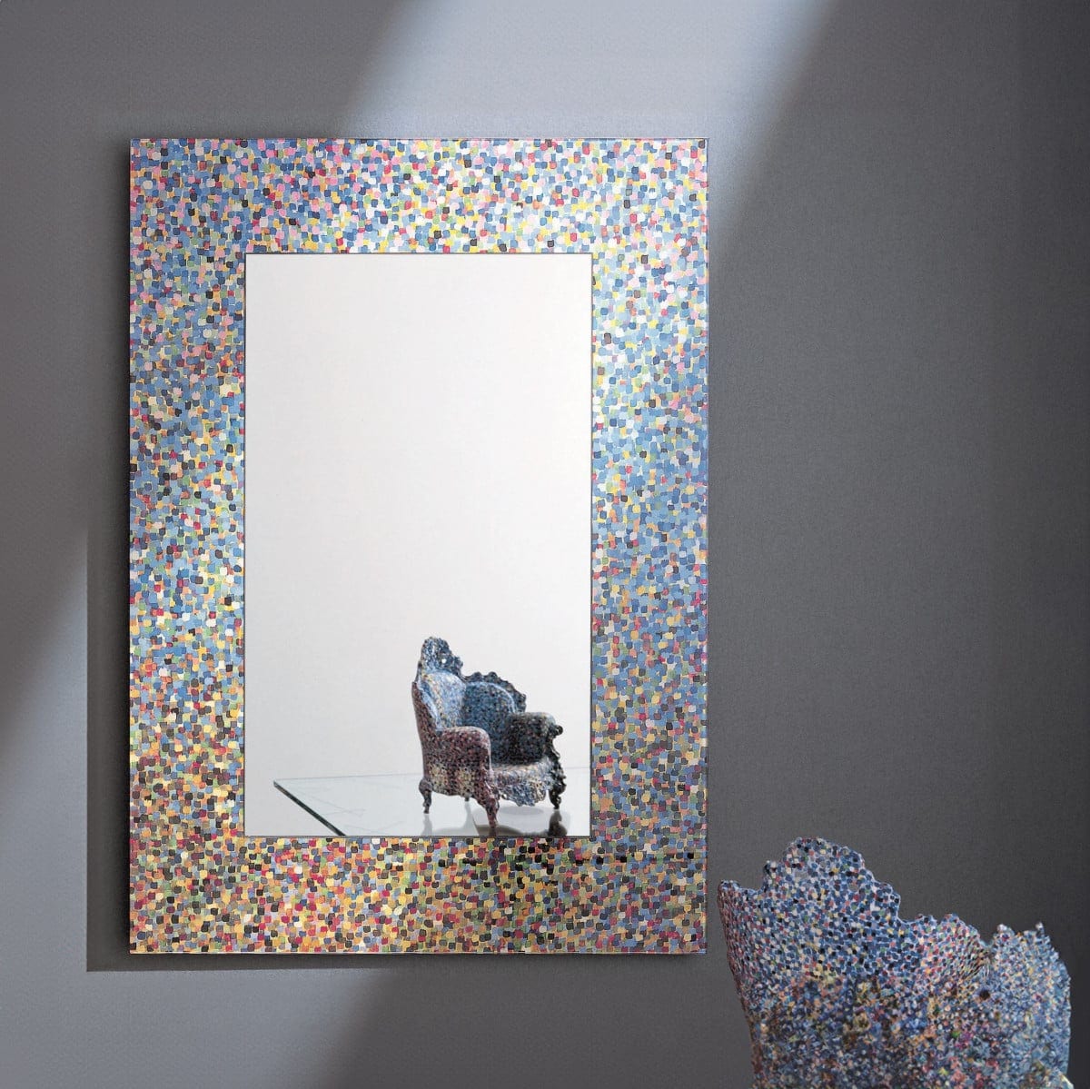 Specchio di Proust is a rectangular mirror with a frame that refuses to stay quiet. The surface is polychrome and deliberately textured, defined by visible paint-stroke marks that read as movement rather than pattern. It feels graphic from across the room, then more nuanced up close. And it still stays disciplined in shape, which keeps the look from getting too loud.