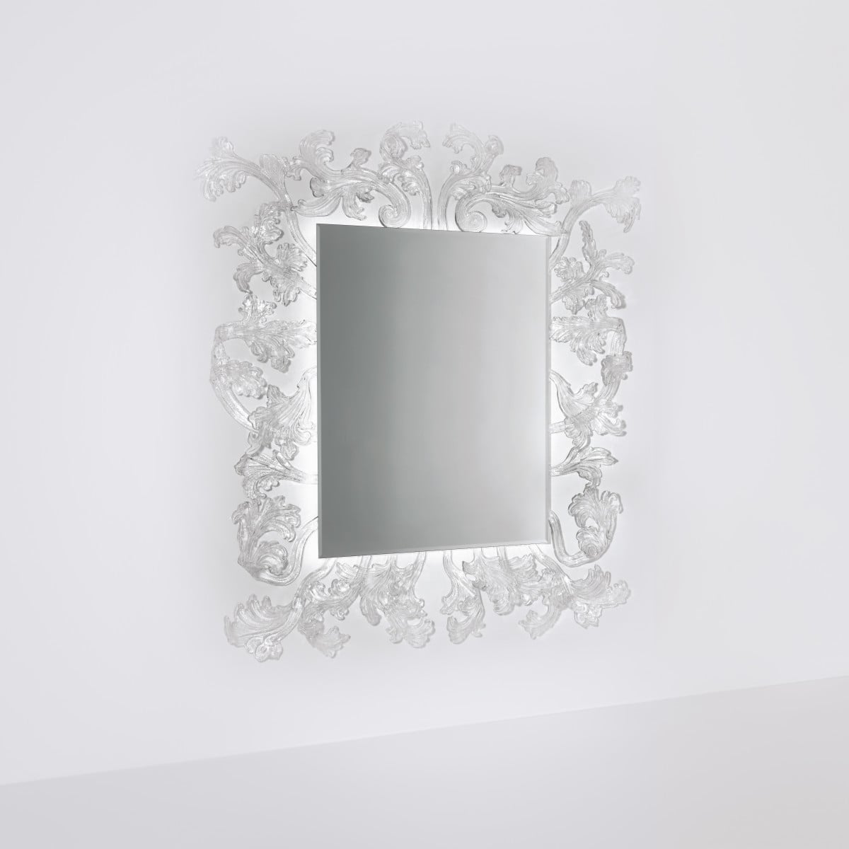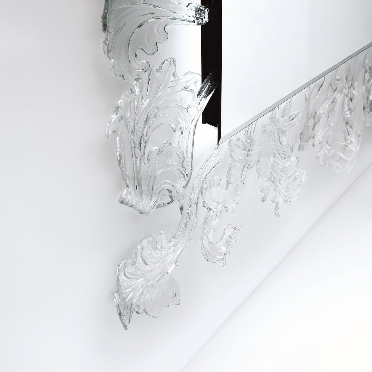 The frame is made in Murano glass through a complex hand-made process. That matters here, because the surface has the subtle variation that only comes from hand work. And it also means each mirror is unique and effectively unrepeatable, even within the same configuration.
