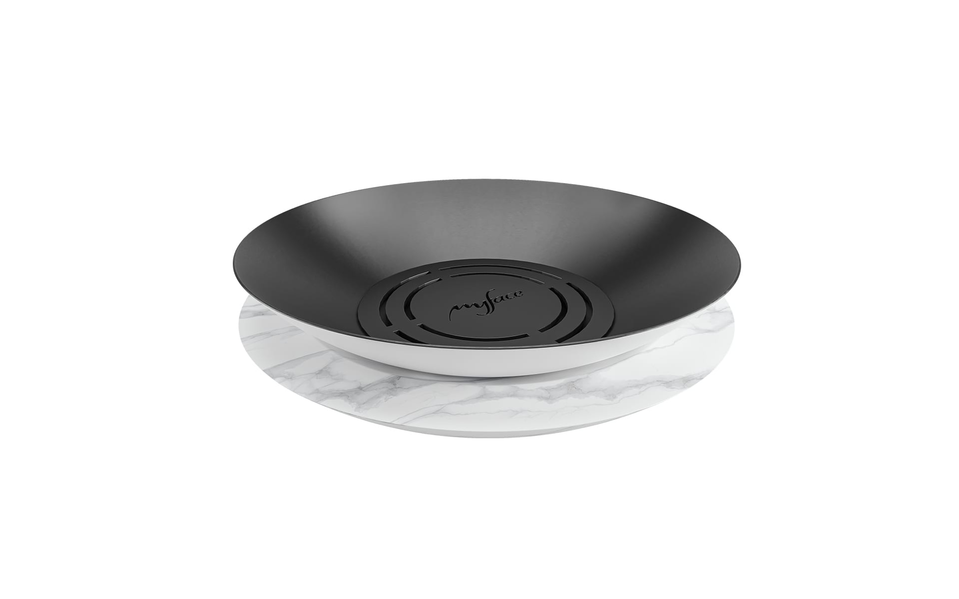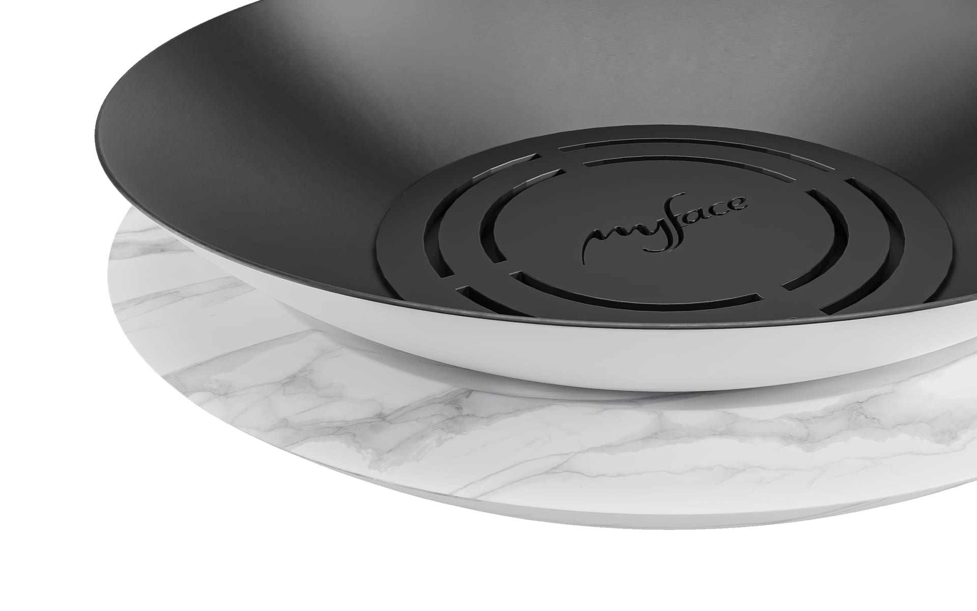 Myface builds this piece with materials chosen for real outdoor life. The standard version pairs a marble base with a metallic structure in carbon steel and refractory steel. The mix feels intentional: stone for presence, steel for strength.