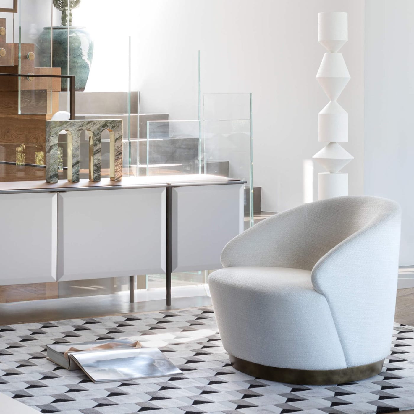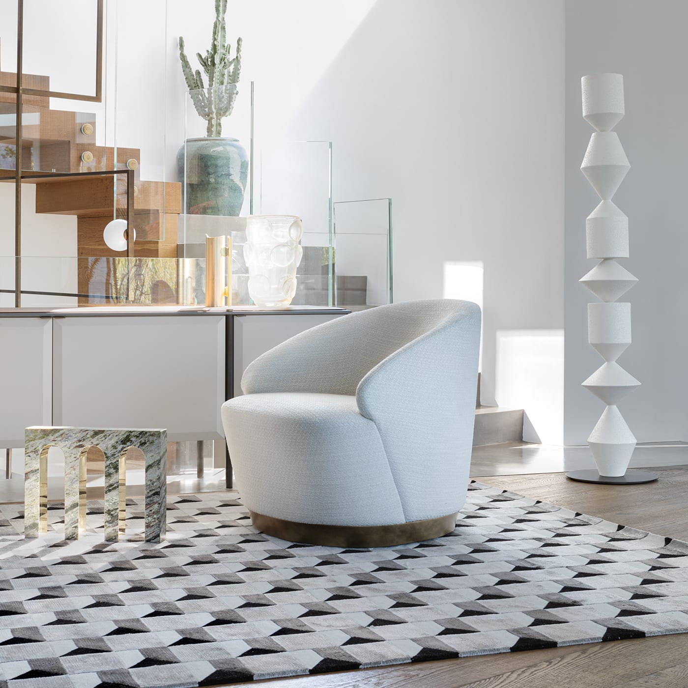 The Brera .23 armchair sits in the same family as the Brera sofas, sharing a clear design language while holding its own as a stand-alone piece. The silhouette is soft and inviting, with rounded volumes that feel considered rather than casual. A curved base in a metallic finish subtly lifts the body of the chair, giving it a lighter presence even with its generous form. Capital lets the line do the work here: nothing feels decorative for its own sake, yet the chair reads as distinctly tailored.