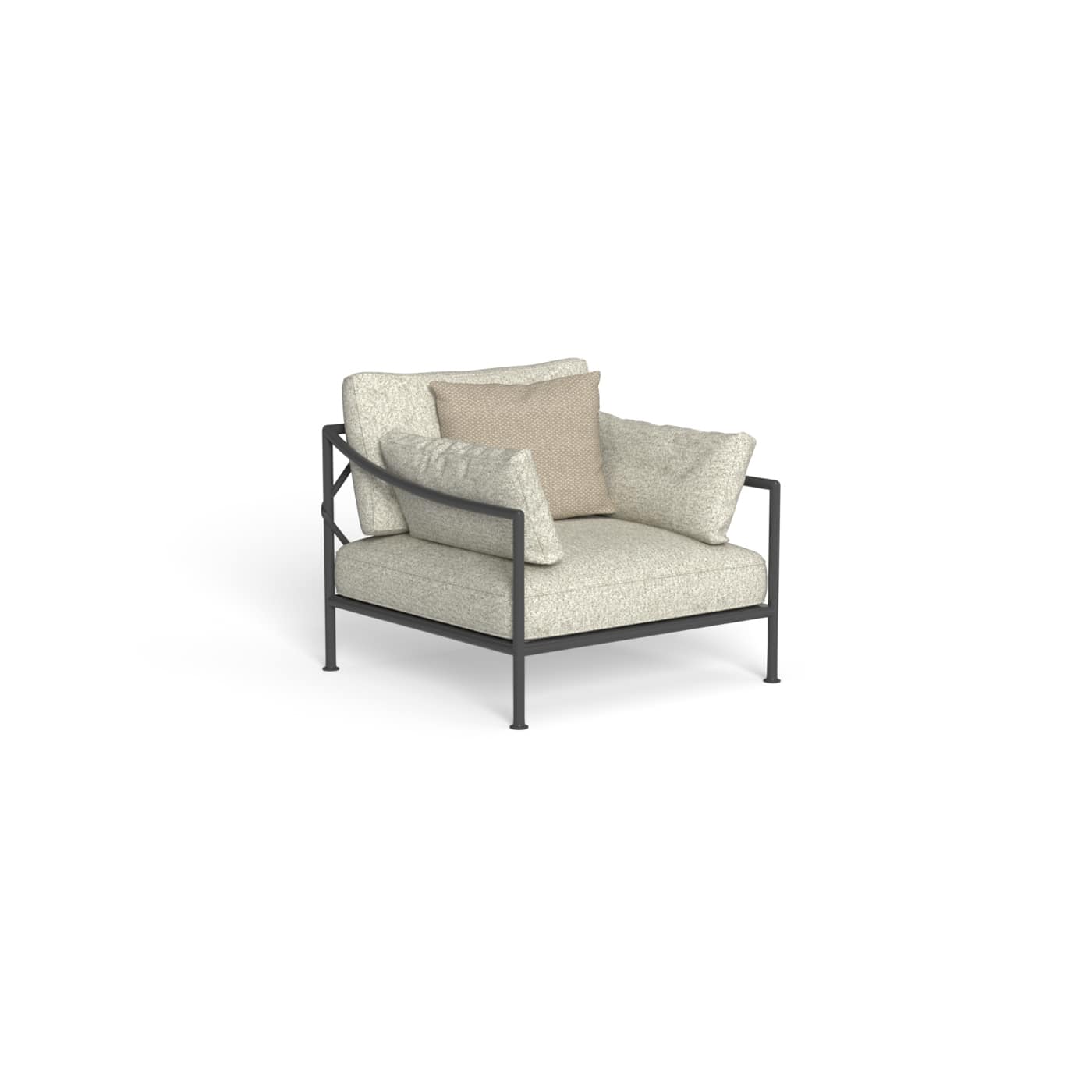 Talenti’s Capri Living Armchair, by Ludovica + Roberto Palomba, is all about clean geometry and quiet ease. A precise metal line frames generous volumes, giving the piece a composed, contemporary stance. The square footprint feels balanced—about 34.25 inches wide and deep—with an overall height of 31.5 inches that sits comfortably in conversation zones without dominating the room.