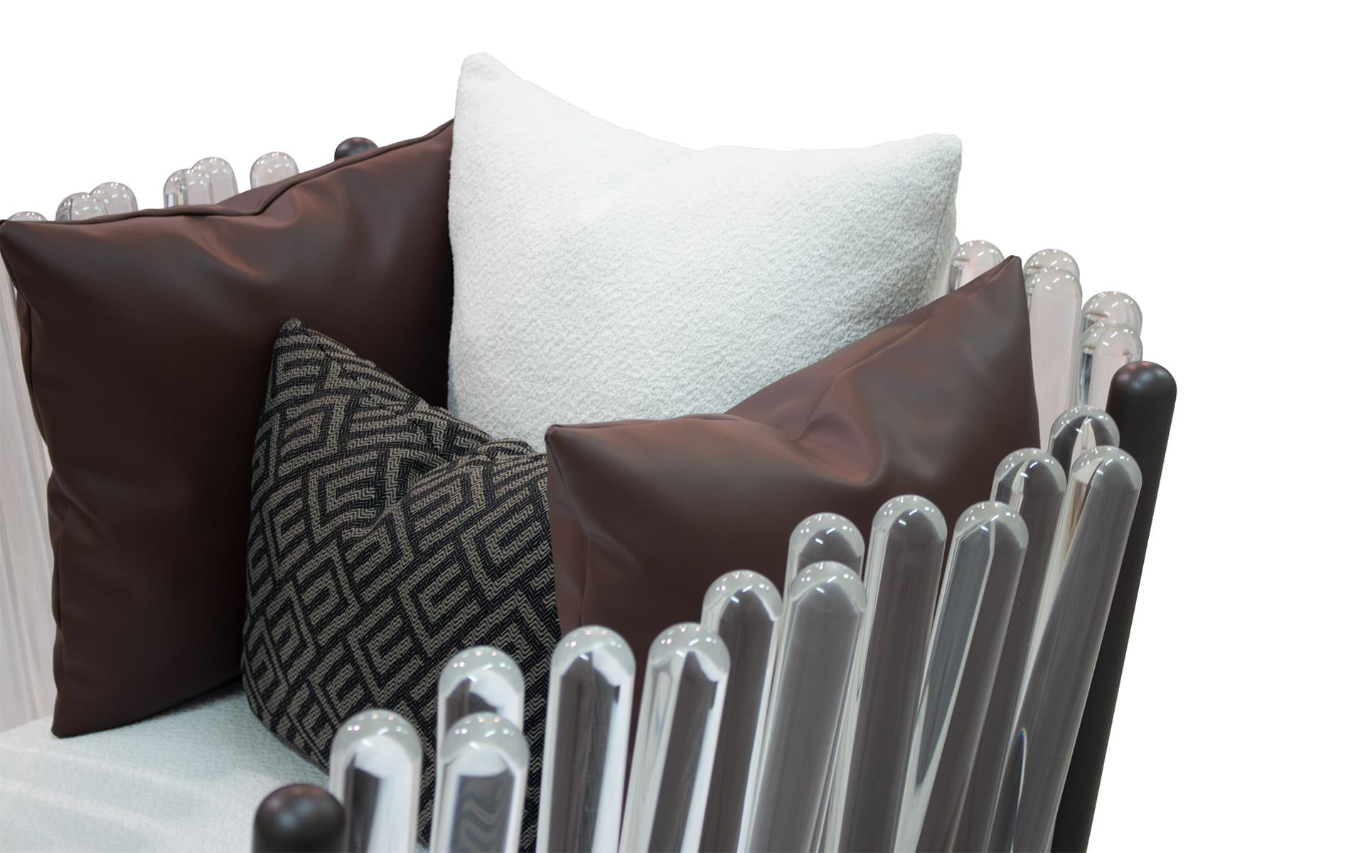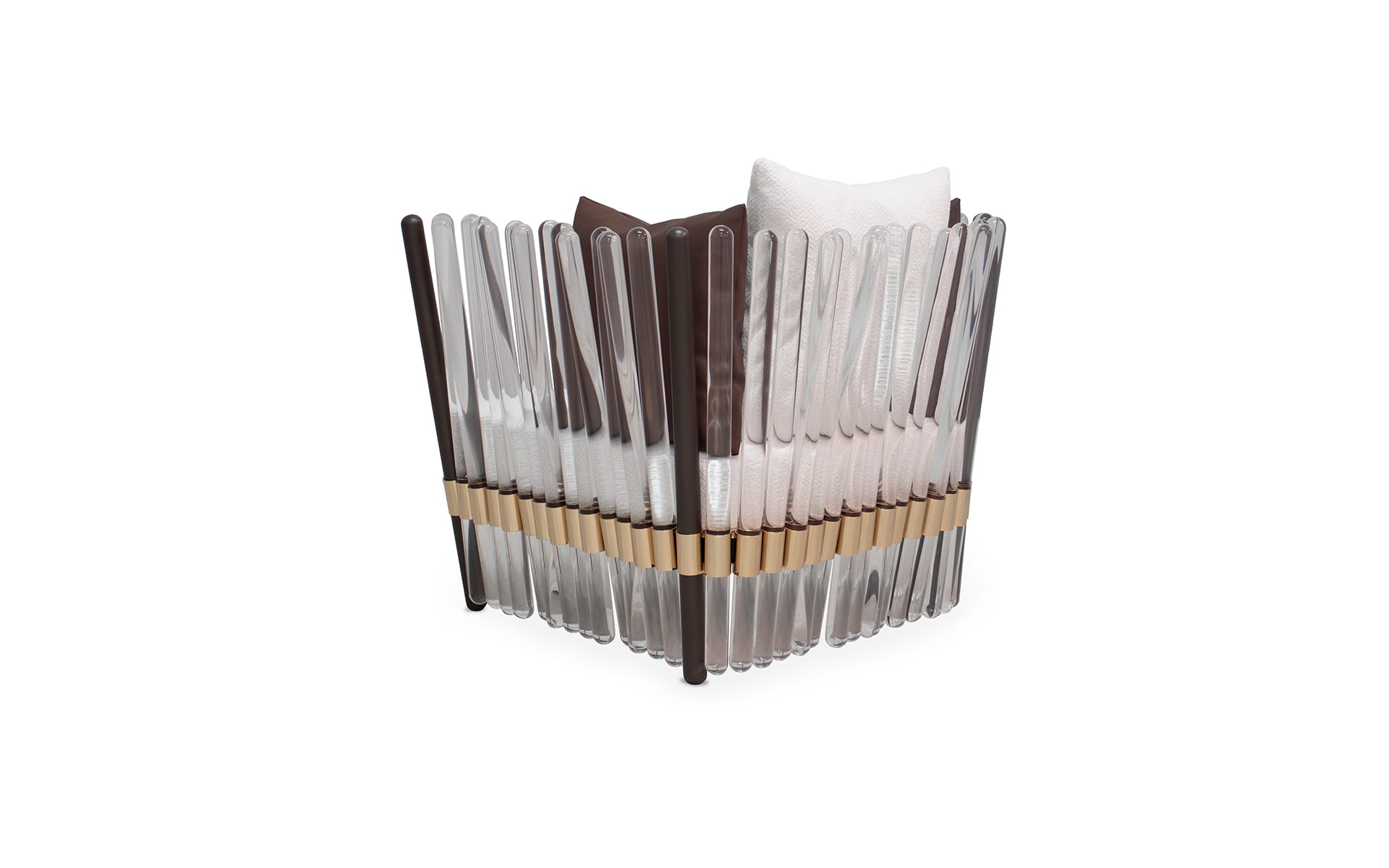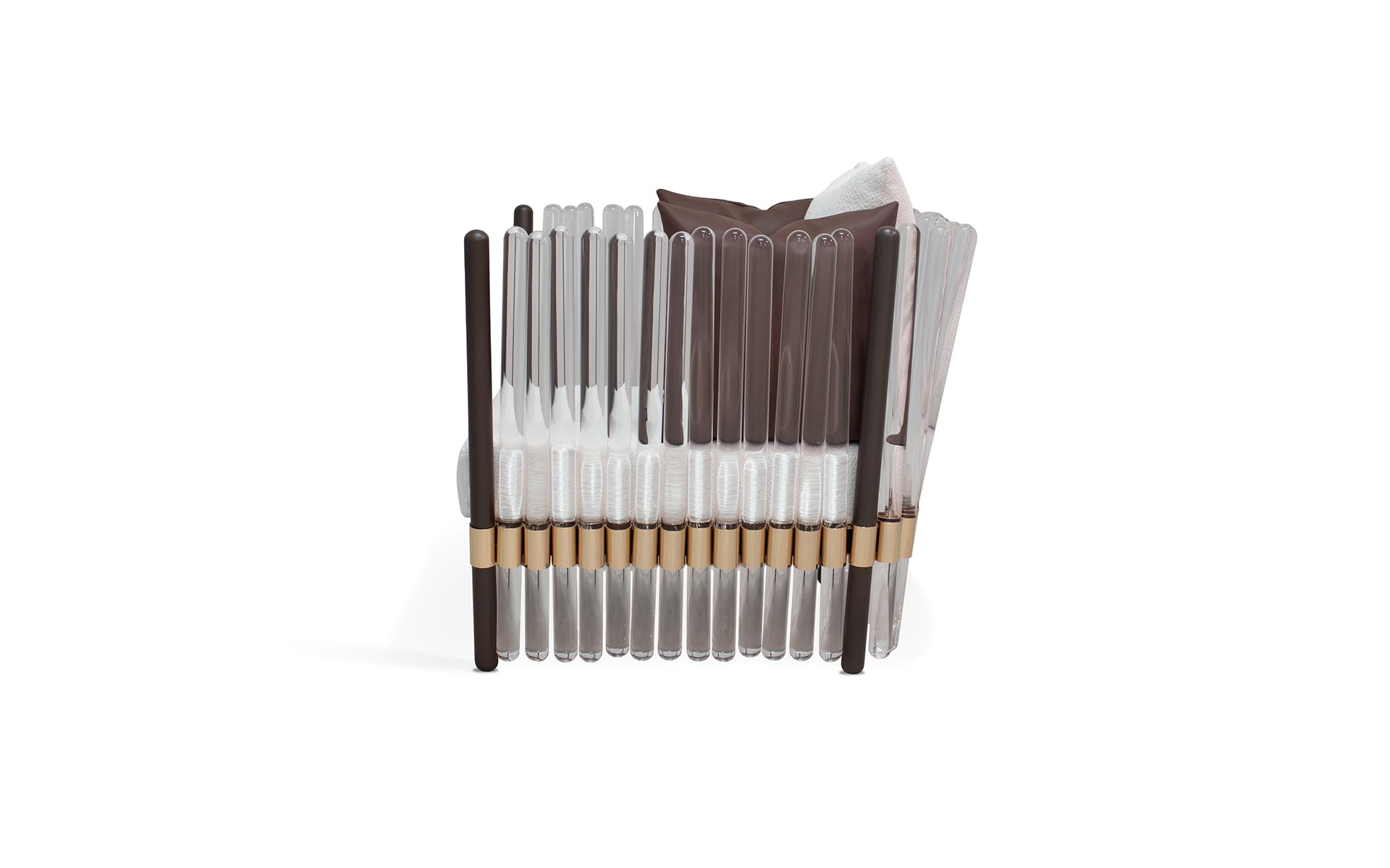 Myface builds the Houdini Armchair around a lacquered stainless steel metallic structure, finished with plated stainless steel details. The contrast is subtle, not flashy, but it adds definition where it matters. The clear acrylic rolls do the expressive work, bringing texture and depth without adding visual clutter.