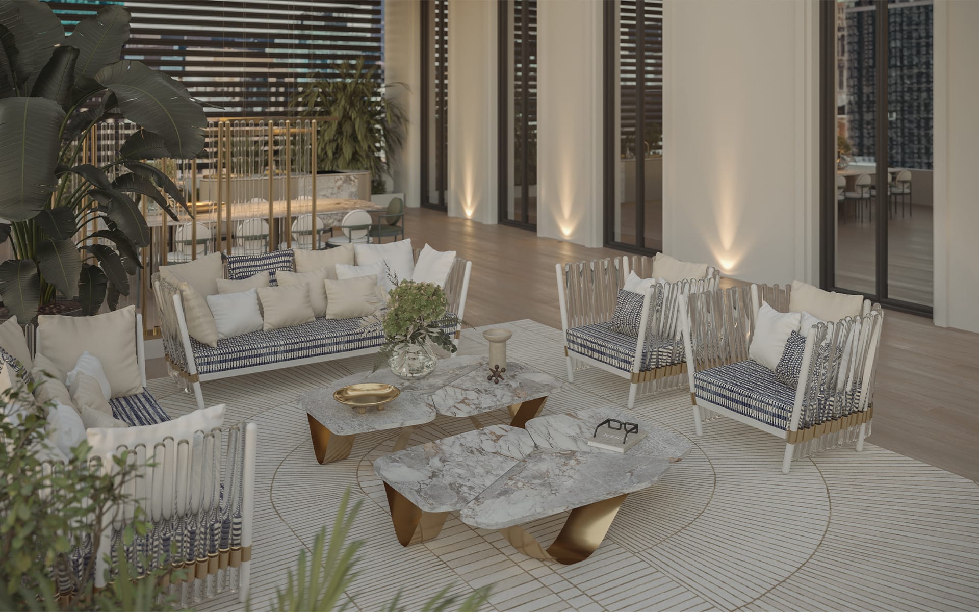 The Houdini Armchair works best where light can move around it. On a terrace, near a pool, or on a covered patio, the acrylic elements pick up the atmosphere and shift with the setting. It blends into its surroundings in a smart way, letting views and landscaping come through.