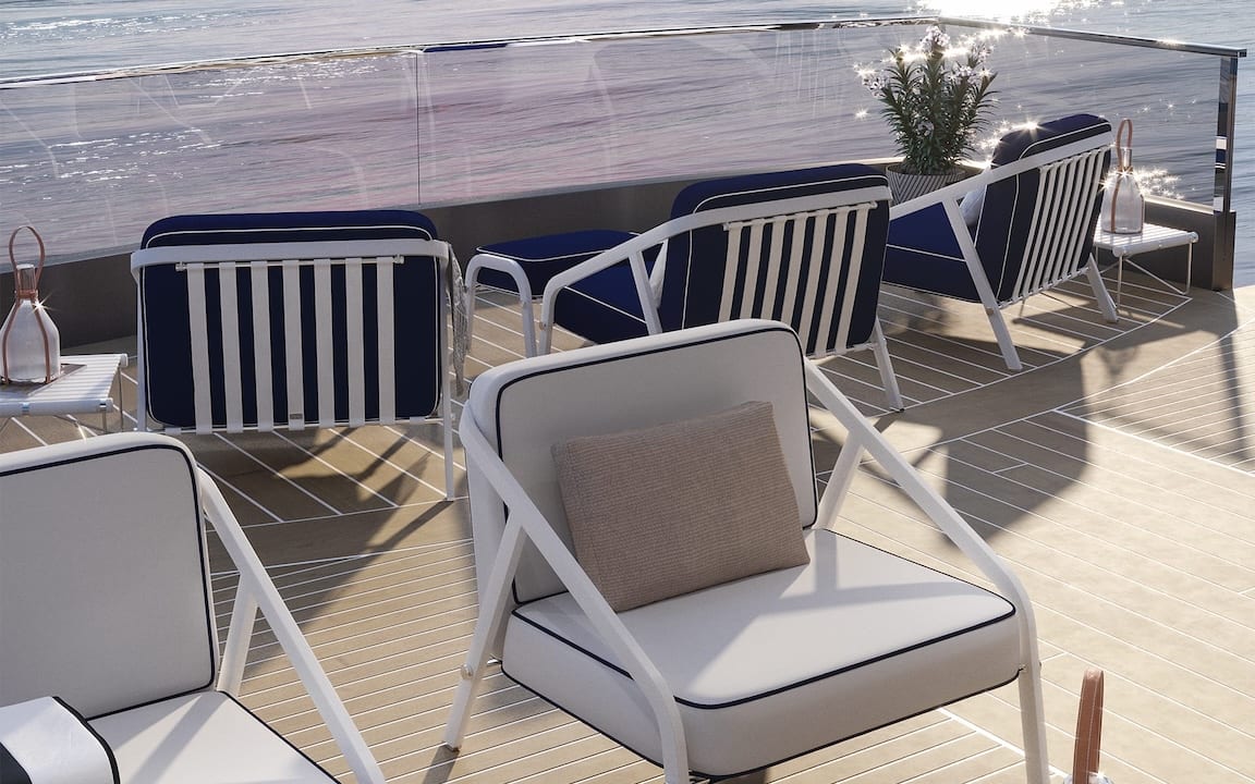 Built for outdoor life, the structure is lacquered aluminum, chosen for durability and a crisp finish. Metallic details are plated stainless steel, adding a subtle contrast that keeps the look sharp. Upholstery is acrylic fabric, with outdoor leather used for the piping and straps. The mix feels intentional: practical materials, refined handling.