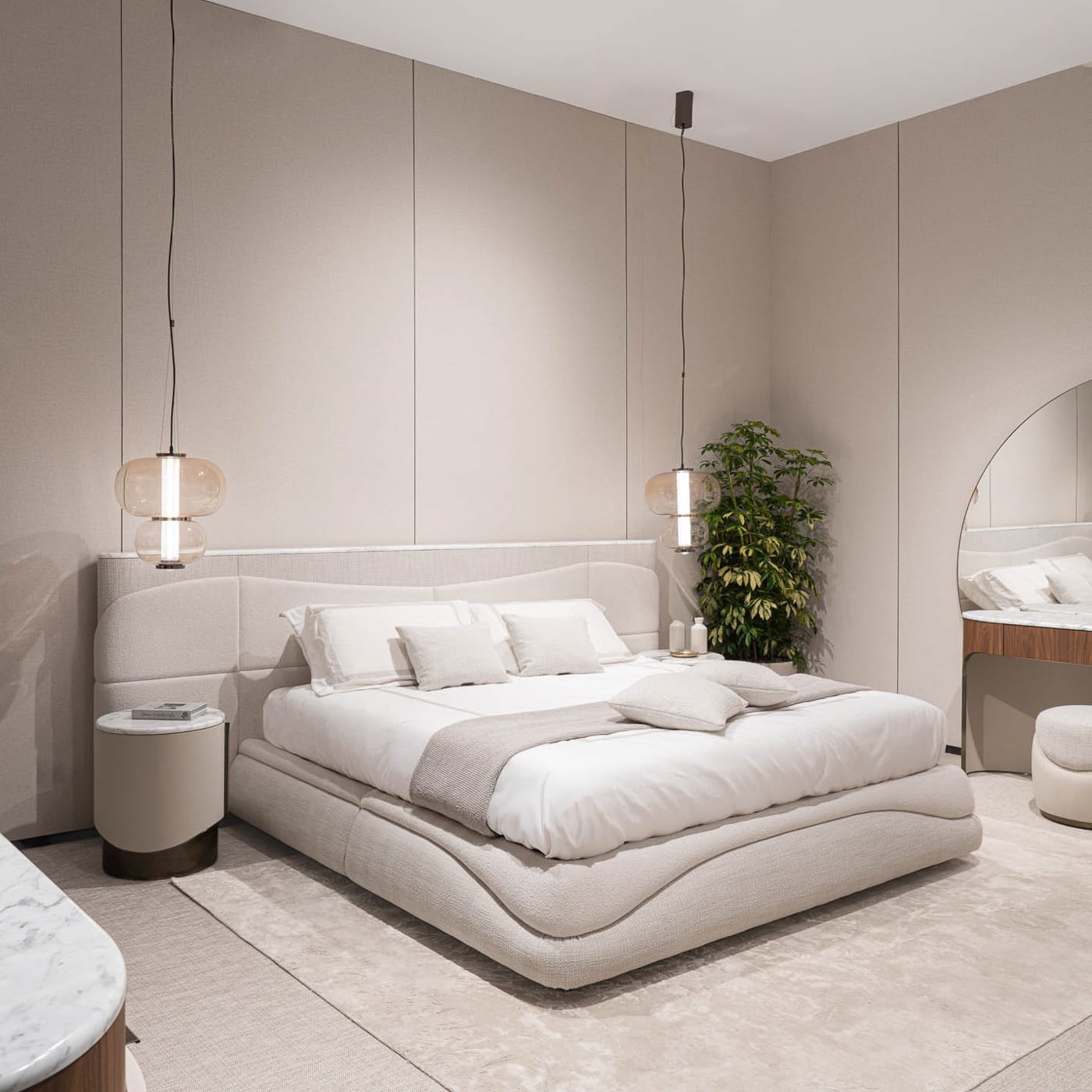 The Clori bed draws the eye with calm, continuous lines. The silhouette is fluid rather than angular, giving the piece a gentle presence in the room. Curves soften the structure and keep it visually light, even when it commands the space as the main focus. The design feels considered but not overworked, which makes it easy to read at a glance and easy to live with every day.