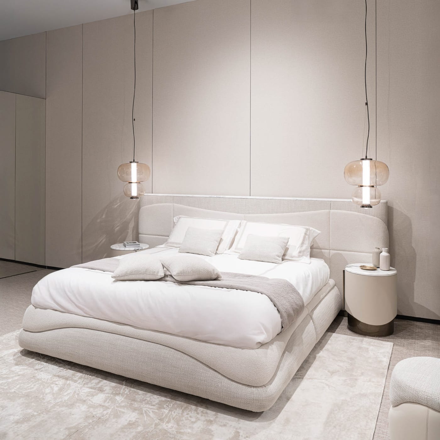 This bed is conceived as part of a wider story, where every element shares the same smooth, sinuous language. In that context, Clori sets the tone. It is offered in a curated range of finishes that pair easily with other pieces in the bedroom. The look can shift from quiet to more graphic depending on the chosen mix, but the underlying design remains calm and balanced.
