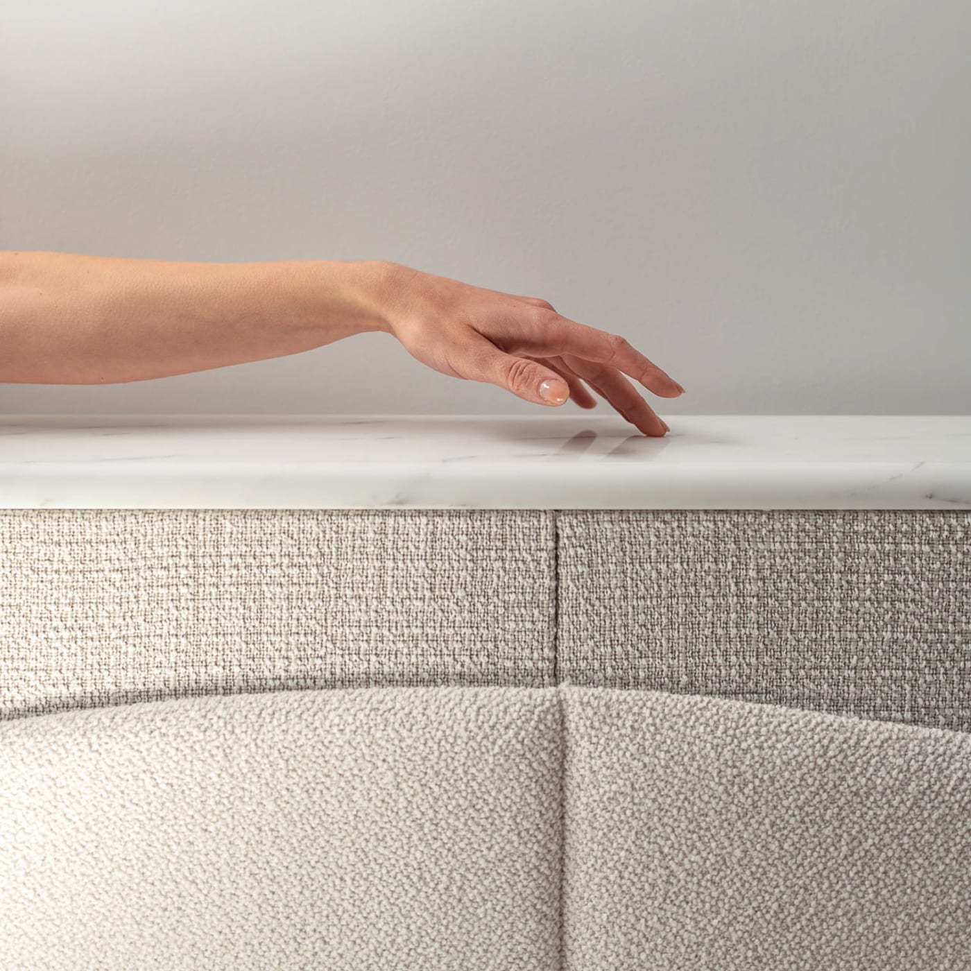 Clori is shaped to create an inviting, protective feel. The measured height supports reading or working in bed without dominating the wall behind. Depth and width give a reassuring sense of scale, making the sleeping area feel substantial and well defined. The soft curves help the bed feel welcoming from every angle, not just from the front.