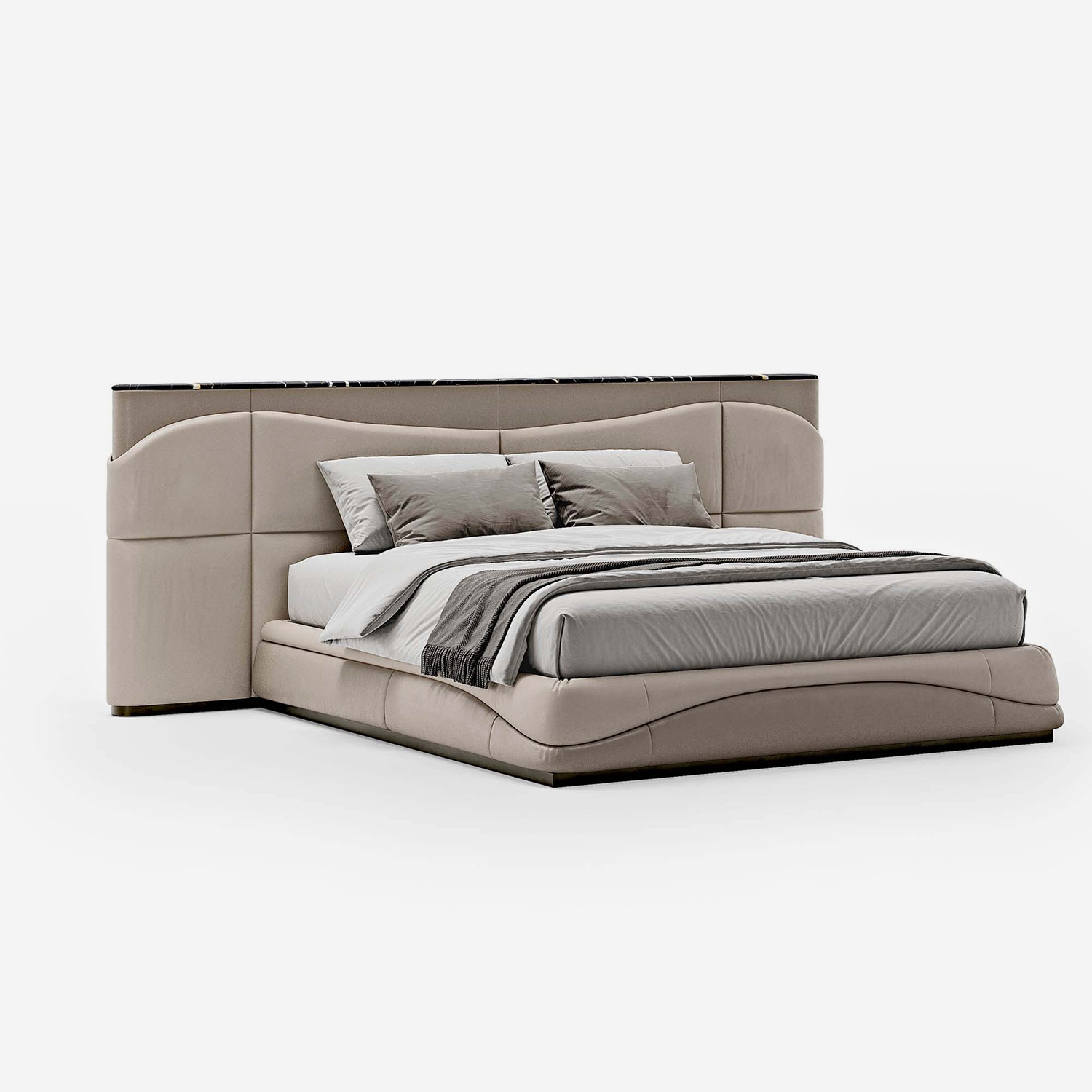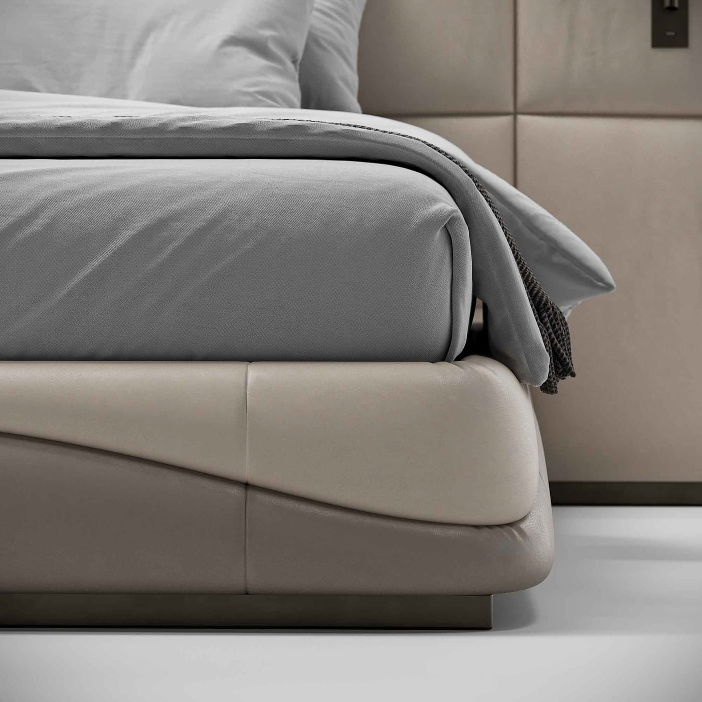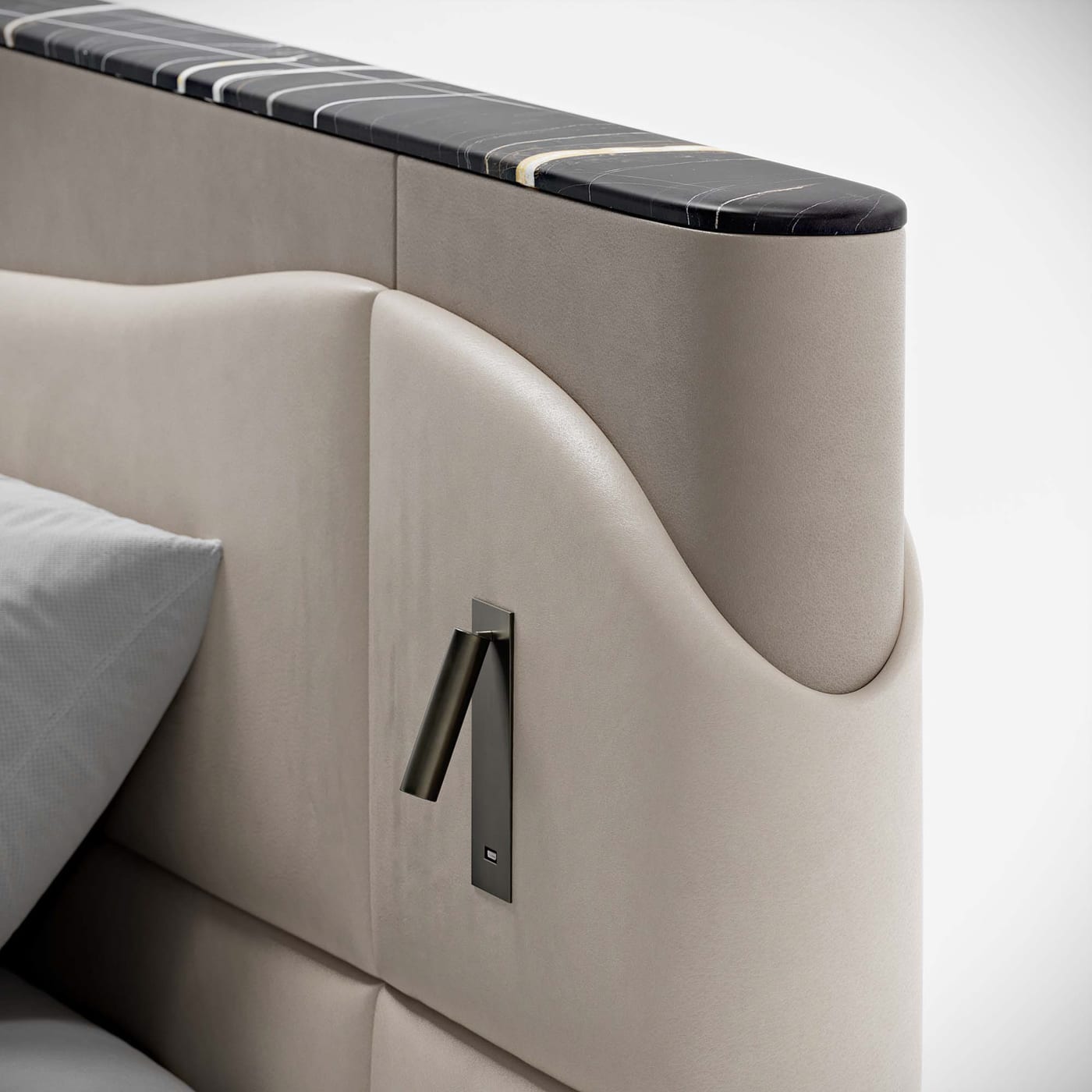 The palette spans metals, marbles, leather, fabrics, and wood, so the bed can lean warmer or cooler as needed. Surfaces are designed to feel good to the touch and to sit comfortably alongside high-quality textiles and accessories. Nothing is loud; details are there to underline the shape, not compete with it.