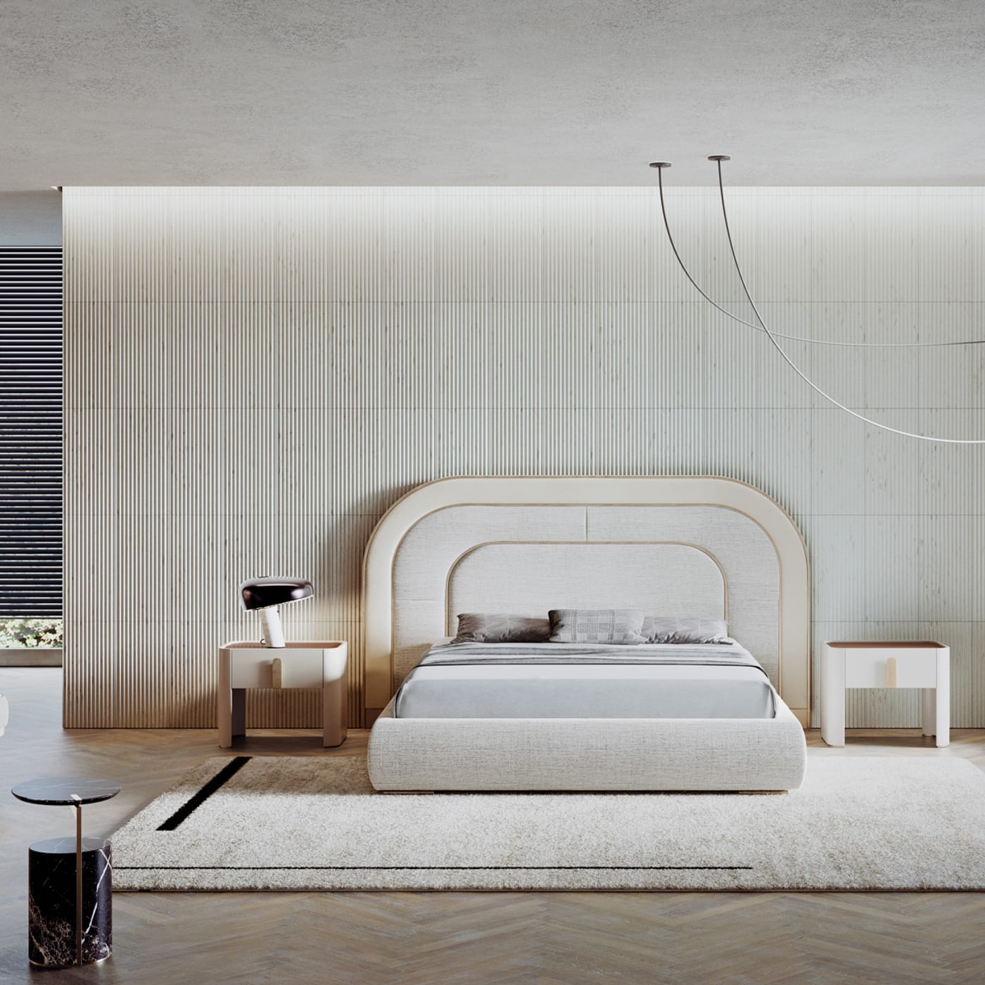 Eden .24 works well as a central piece in a master bedroom, where its rounded shape softens more angular architecture and furniture. It suits both minimal spaces and richer interiors, depending on the selected upholstery and metal tone.
