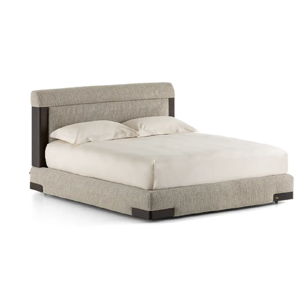 The interplay of soft textile and dark solid wood is the defining character of the Elia. The espresso-toned corner details frame the headboard and base with quiet authority, introducing a material contrast that feels considered rather than decorative. The result is a silhouette that sits equally well in a contemporary apartment as it does in a more classically furnished bedroom.