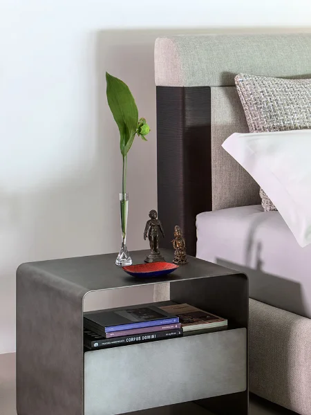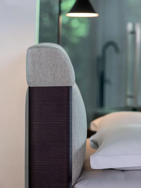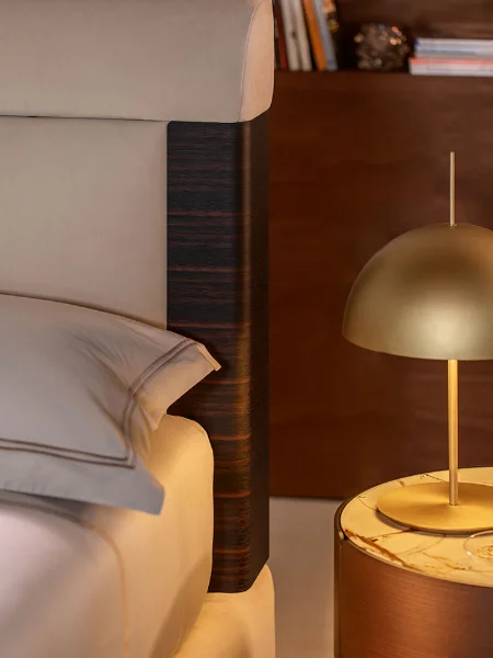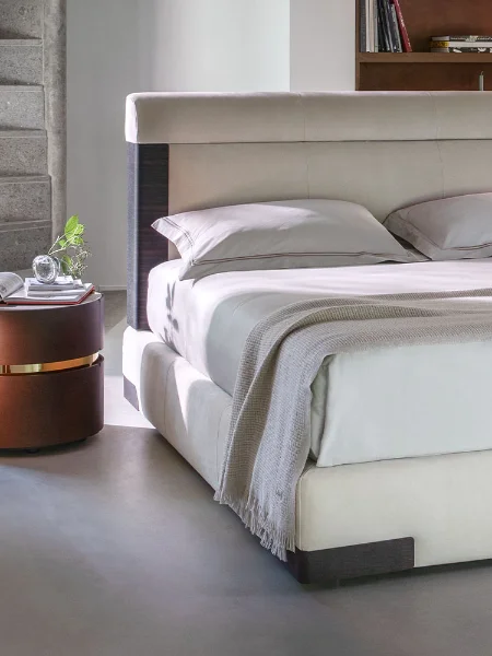 Designed by Matteo Nunziati, the Elia is a study in disciplined elegance. Its compact footprint belies a presence that commands the room ; a gently curved, channel-stitched headboard upholstered in a warm greige fabric, anchored at each corner by precisely placed dark wood accents. It is a bed that knows exactly what it is and commits to it fully.
