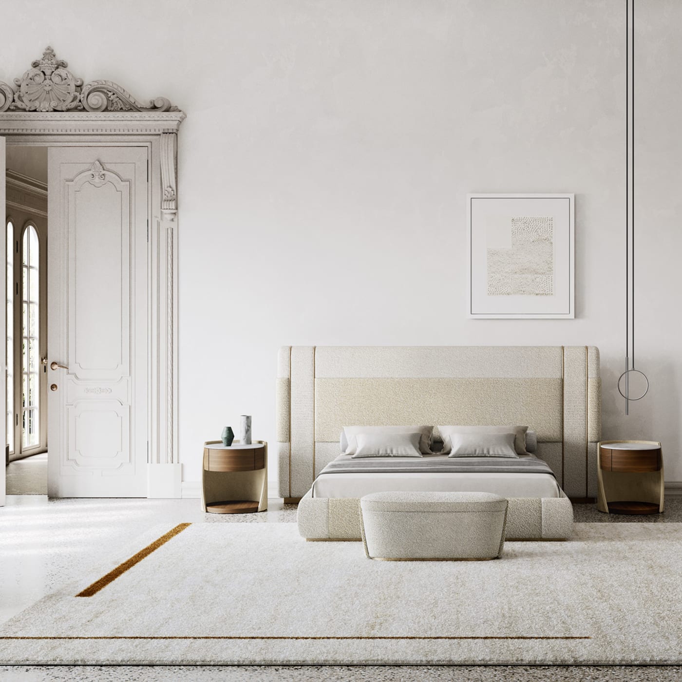 Frey is scaled for a primary bedroom or a well-planned guest suite, where there is room to walk around it comfortably and let it breathe. Its clean geometry pairs easily with both minimal settings and more layered interiors. It can sit against a simple painted wall or in front of architectural paneling without competing.