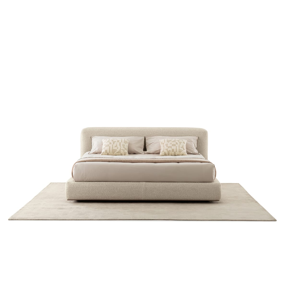 Covering options range across multiple fabric categories (A through E, plus LUX) and leather categories (F and G LUX), so the bed adapts to different interiors without compromise. A warm bouclé for a softer bedroom. A structured leather for something more defined. The surface changes the character noticeably.