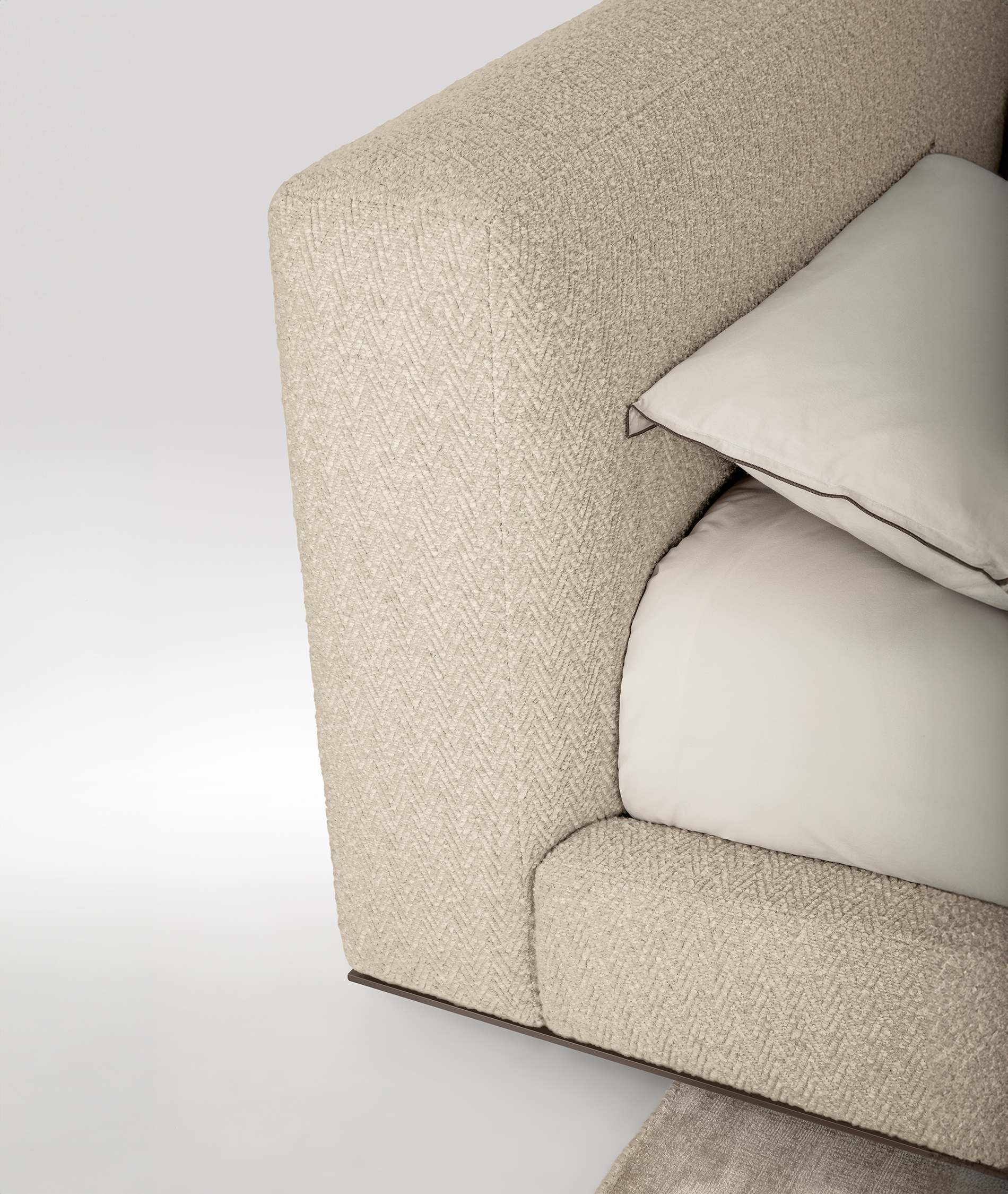 The padding runs along the full perimeter frame, not just the headboard. So whether someone is sitting up reading or just resting an arm on the side rail, there’s a cushioned surface meeting them. The Gladys doesn’t rely on one standout feature. It works because everything — density, shape, material layering — is considered together.