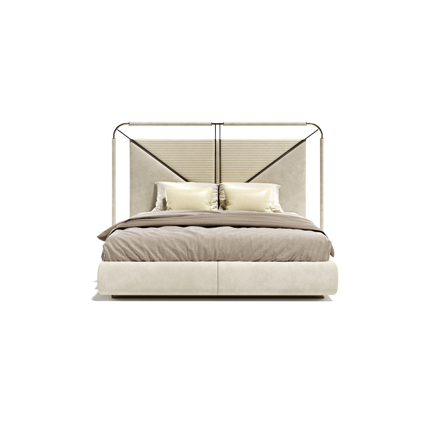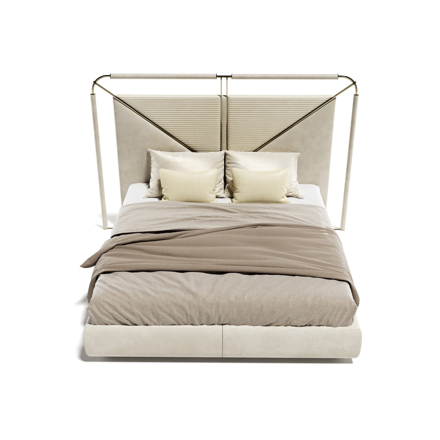 Padding is in undeformable polyurethane foam in different densities, shaped to keep its lines crisp over time. With a total weight of about 463 lbs, the bed feels firmly grounded, not light or fragile. Finishing options in metals, leather, and fabrics allow the character of the structure to adapt to different interiors while keeping the same precise build quality.