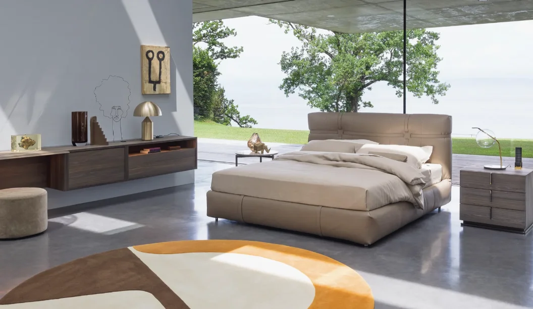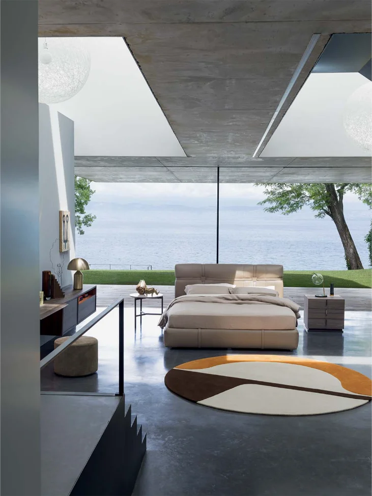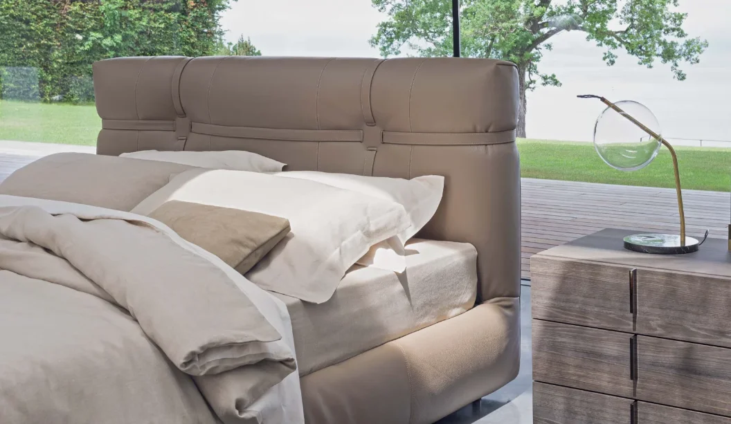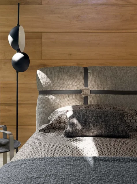 The New Bond Double Bed, a remarkable design by Matteo Nunziati in 2018, redefines luxury in modern bedroom furnishings. This double-size bed stands out for its elegantly tailored details, particularly the striking combination of straps and eyelets that adorn the headboard and the panel surrounding the bed. This distinctive feature adds a contemporary flair, making New Bond a true centerpiece in any bedroom.