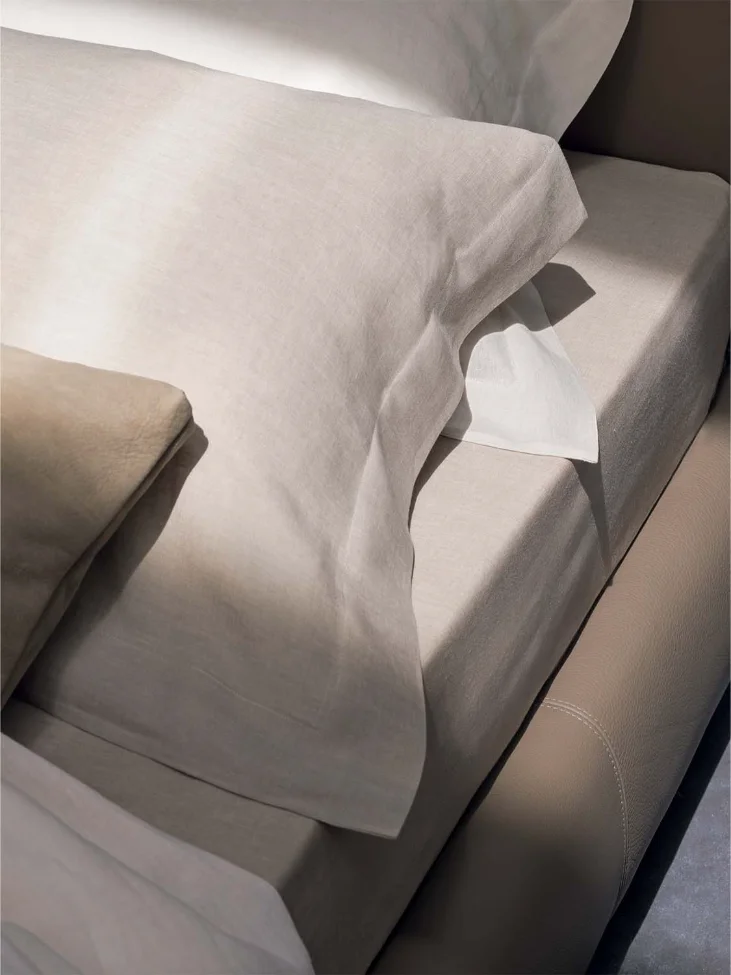 Crafted with an emphasis on quality and style, New Bond Double Bed is available in two exquisite options: premium leather or soft fabric covers. The leather version enhances the bed’s sophisticated appeal, with straps that seamlessly match the upholstery, creating a cohesive and polished look. This unique use of leather elevates the design, offering a contemporary edge that is both original and unmistakable.