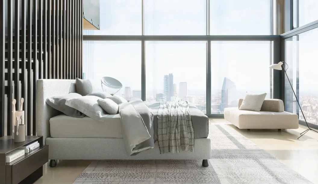 The Notturno 2 Double Bed can be equipped with a raised base, presenting a sharp, clean design that contributes to a distinctly contemporary bedroom atmosphere. This elevated feature not only adds a modern touch but also enhances the visual space, making the room feel airier and more open. The sleek lines and minimalist silhouette of Notturno 2 create a sophisticated backdrop for various décor styles, from minimalist chic to cozy warmth.