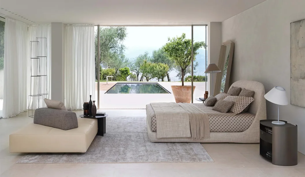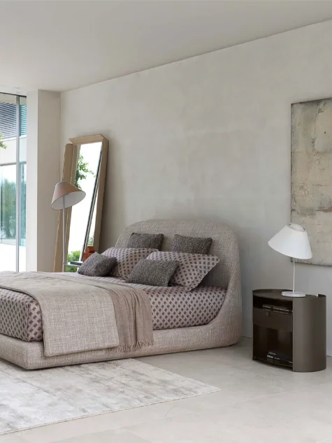 Introducing the Taormina Double Bed, a remarkable design by Centro Ricerche Flou from 2021, specifically crafted to accommodate exceptionally deep mattresses. This double-size bed not only prioritizes comfort but also elevates the aesthetic of any bedroom. The seamless, softly curved headboard rises without interruptions from the bed base, creating a fluid silhouette that exudes relaxation and intimacy.