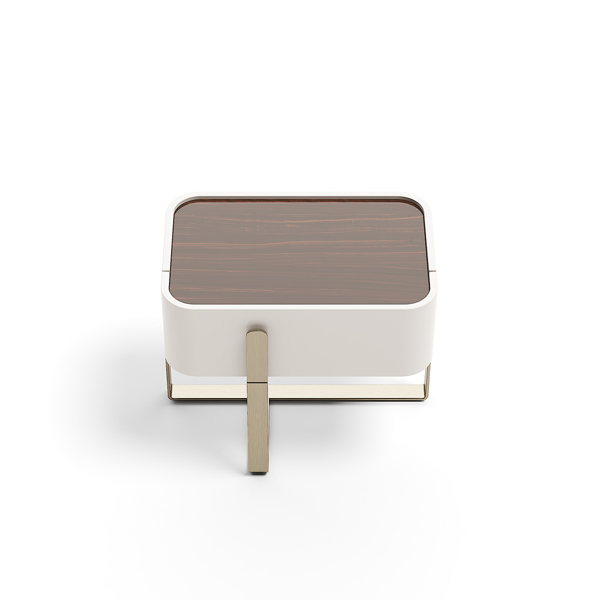 Eden L combines a lacquered structure with a wooden top, anchored by a steel handle and matching steel base. The contrast between the smooth lacquer and the natural feel of wood gives the nightstand a quiet richness, without heavy decoration. It is a straightforward construction, made to be used every day.