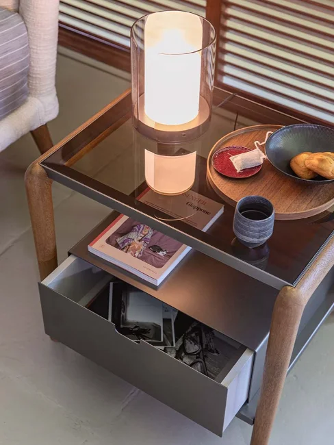 The thoughtful design of the Gaudi Night Tables artfully combines wood, metal, and glass, creating an essential and refined aesthetic that enhances any bedroom decor. The standout feature is the capacious matt burnished metal drawer located on the bottom shelf, which provides ample space for storing personal items, keeping your bedside organized and clutter-free.