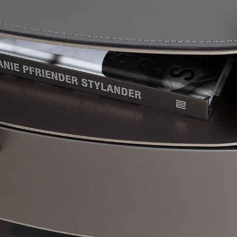 To further enhance its functionality, the raised edge of the top can be fitted with a hide pad that matches the metal finishes, adding a layer of sophistication and protection to the surface.