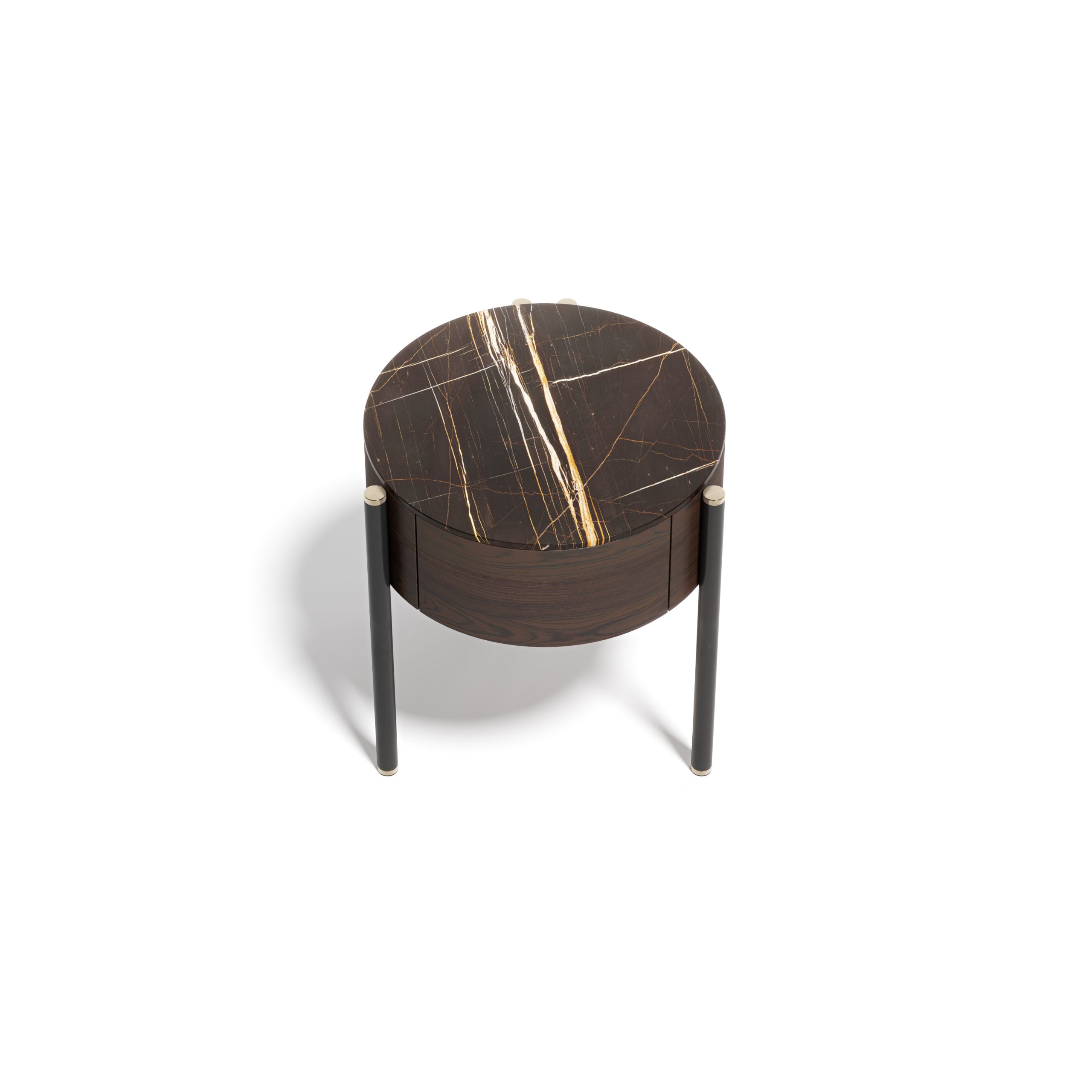 An optional marble top introduces a different temperature and tactility, turning the nightstand into a more graphic presence if desired. The finishes span wood, marbles, and metals, allowing the piece to lean warmer or cooler depending on the space. With a weight ranging approximately from 26 to 42 pounds, depending on configuration, it is sturdy enough for everyday use yet manageable to move when the room needs to shift.