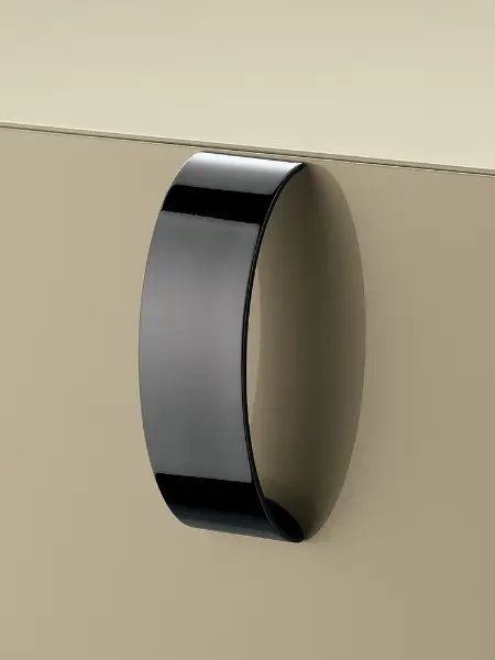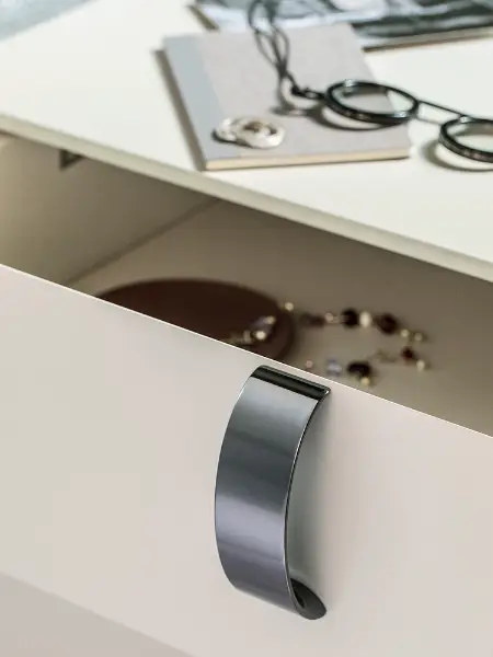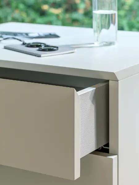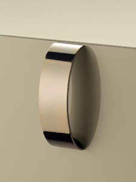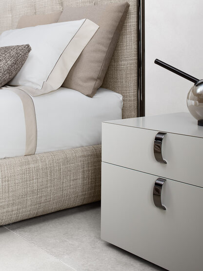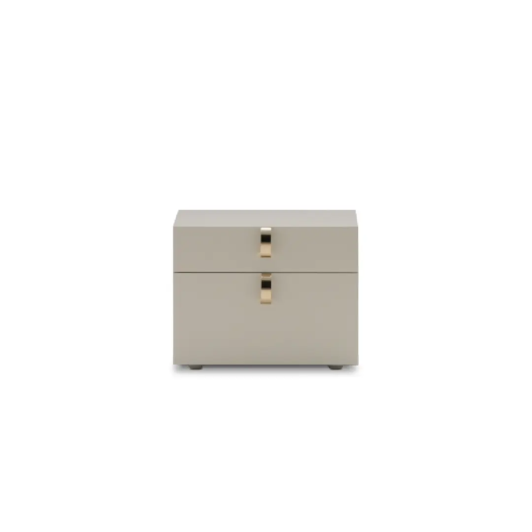 Designed by Rodolfo Dordoni, the Splendor distils the bedside table to its purest and most considered form. Its cubic silhouette is rendered in a soft greige lacquer, a finish of such smoothness and restraint that the eye is drawn immediately to the single detail that matters: a pair of polished rose gold handles, looped with quiet precision across each drawer face.