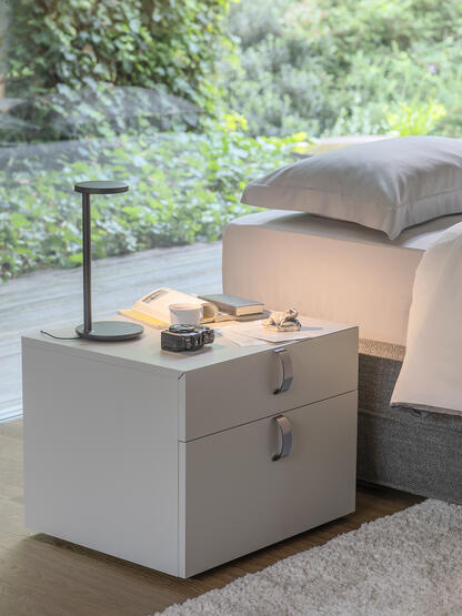 Two generous drawers provide ample storage for the essentials of the bedside, while the clean flat top offers an unencumbered surface for whatever the night requires. Small feet lift the body just enough to prevent it from reading as too heavy, a considered gesture that keeps the whole composition light.