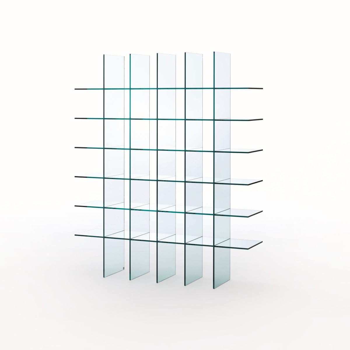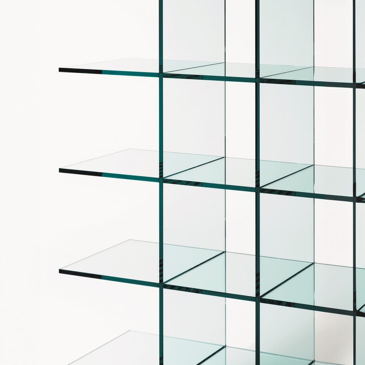 The entire piece is realized in transparent glass, thermowelded in 12 mm thickness, about 0.47 inches. There are no “foreign” elements introduced to hold it together, so the construction stays visually uninterrupted. The glass specified is extralight, which keeps the transparency crisp and the edges clean.
