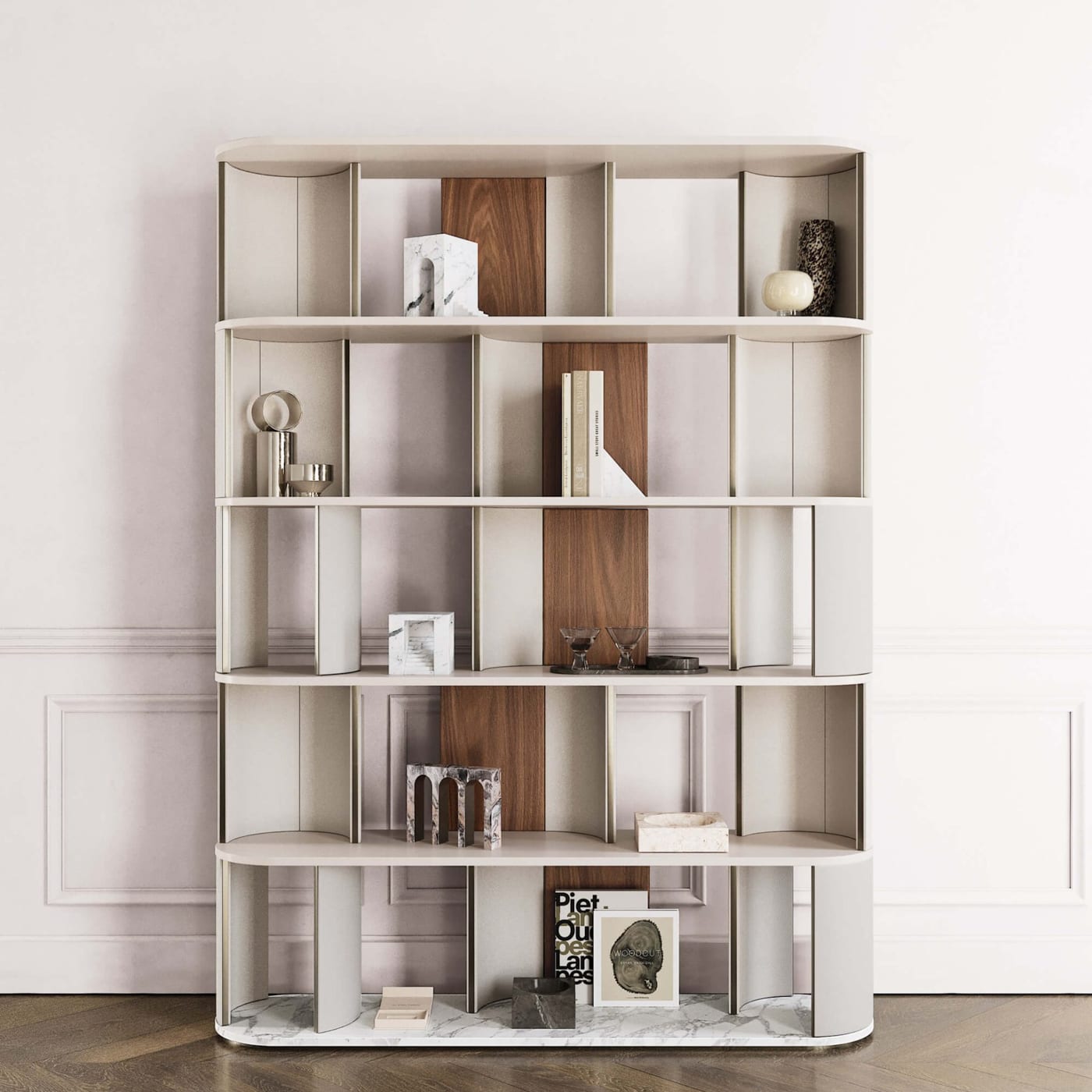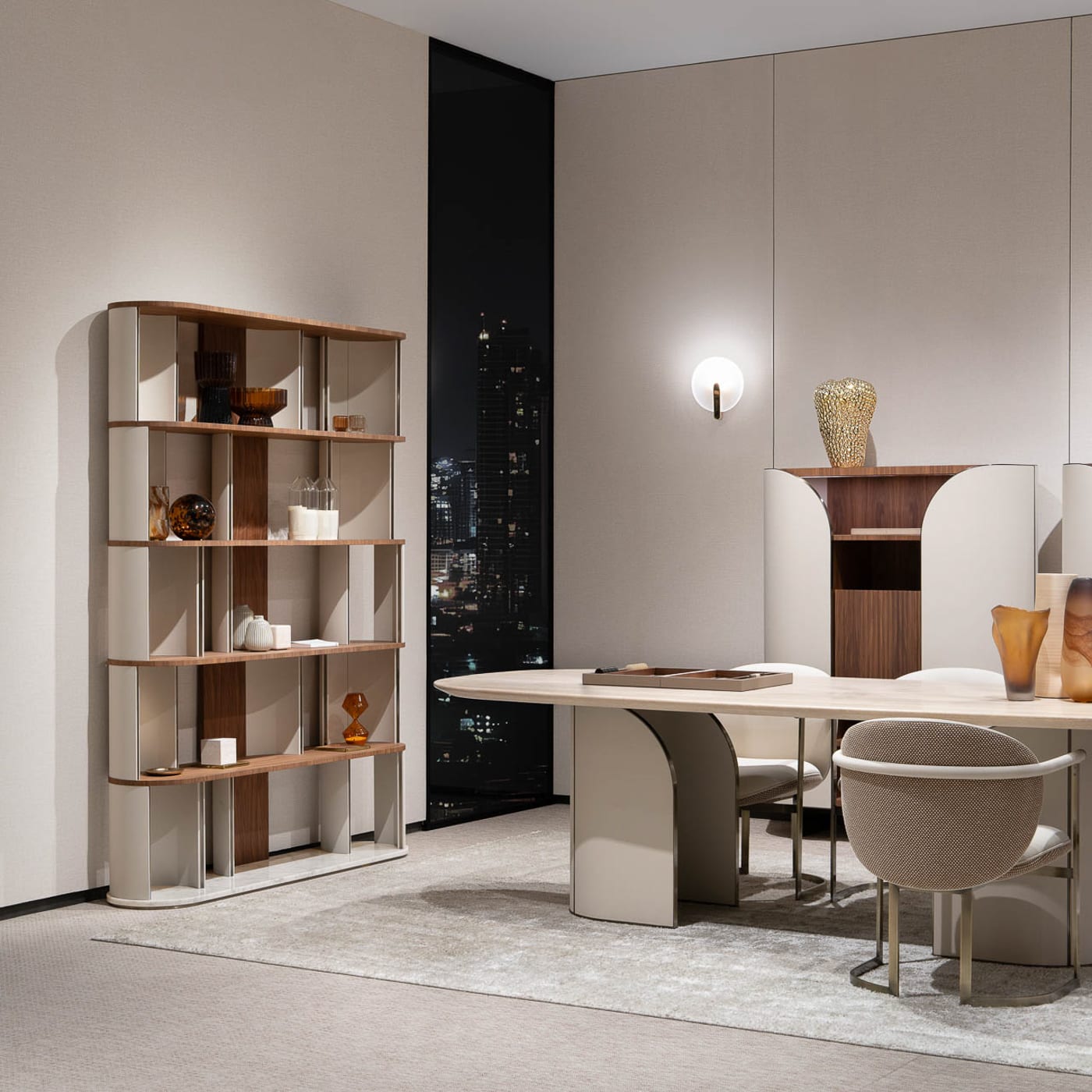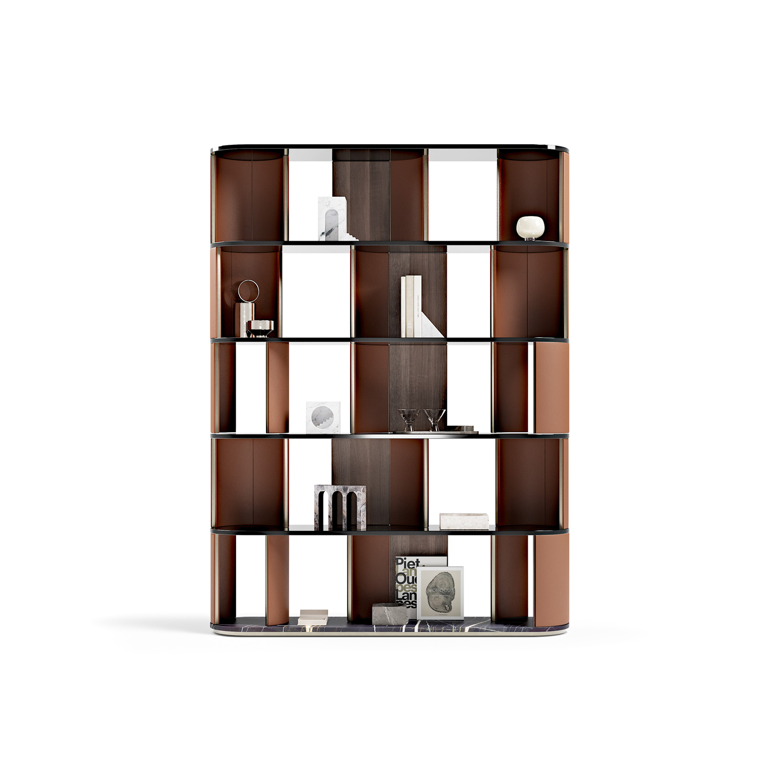 Capital has kept the material palette focused on what lasts: wood, leather, marble, and metal. The substantial weight and wooden core give the bookcase stability over time, while the leather-clad curves and marble or lacquer options are chosen to age with character, not fatigue. Finishes are straightforward and honest, so the piece does not rely on short-lived effects. It is a bookcase designed to stay in place, to be reconfigured with new books and objects as life shifts around it, without losing its quiet, composed presence.