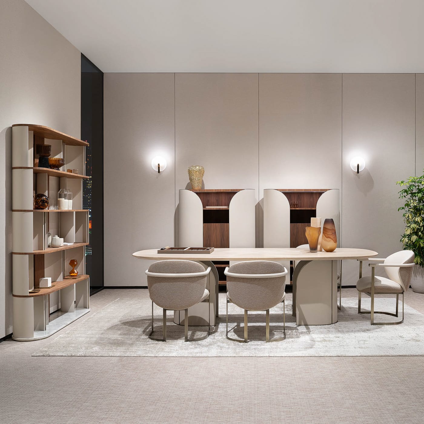 The Sipario bookcase from Capital brings a quiet architectural presence to a room. Designed by Boatto Martino Studio for the 2024 Bookcase collection, it plays with vertical rhythm and gentle curves rather than showy gestures. The structure is clean and linear, then broken by those curved panels that introduce a softer note. From the front it reads almost like a subtle room divider, with open spaces for display and closed sections that suggest order. It feels considered, but not fussy, so it sits comfortably alongside both contemporary and more classic pieces.