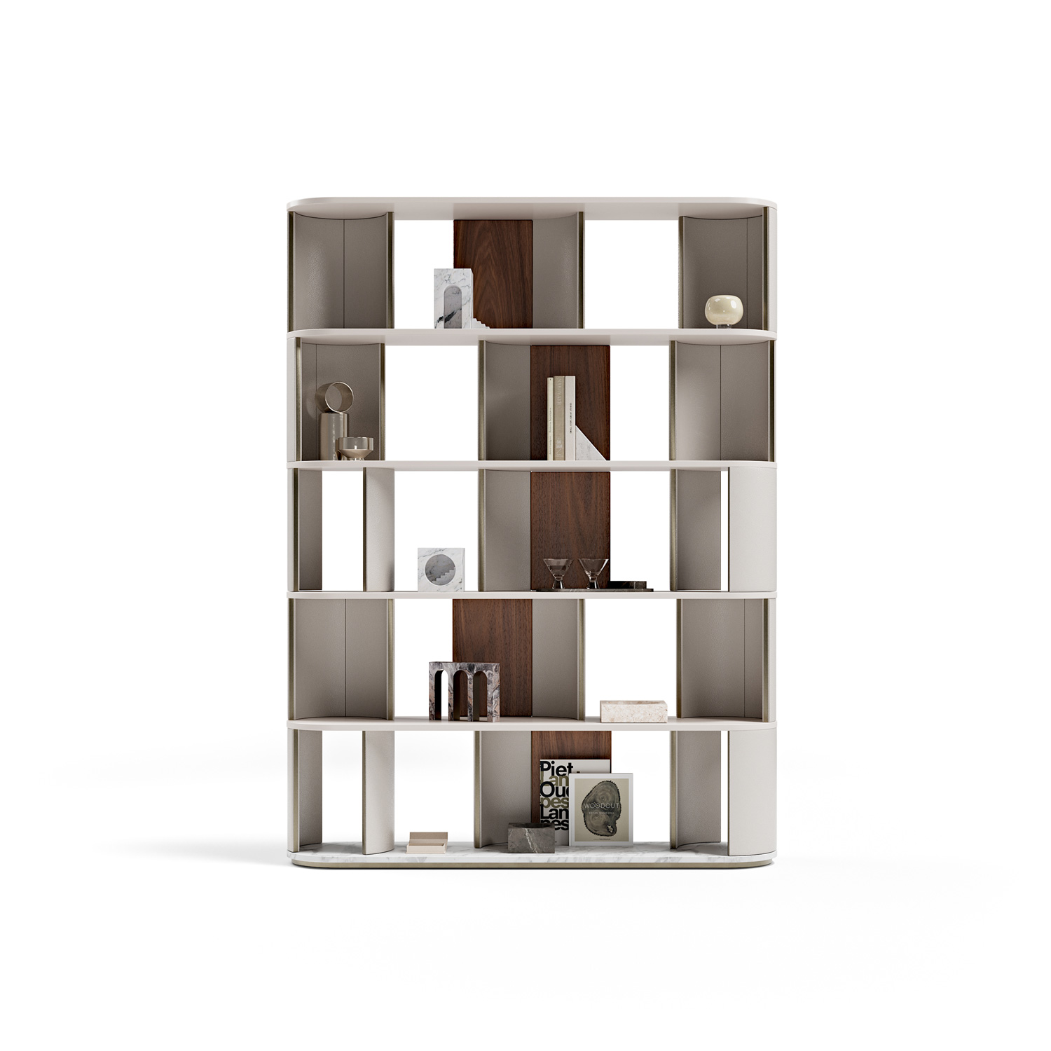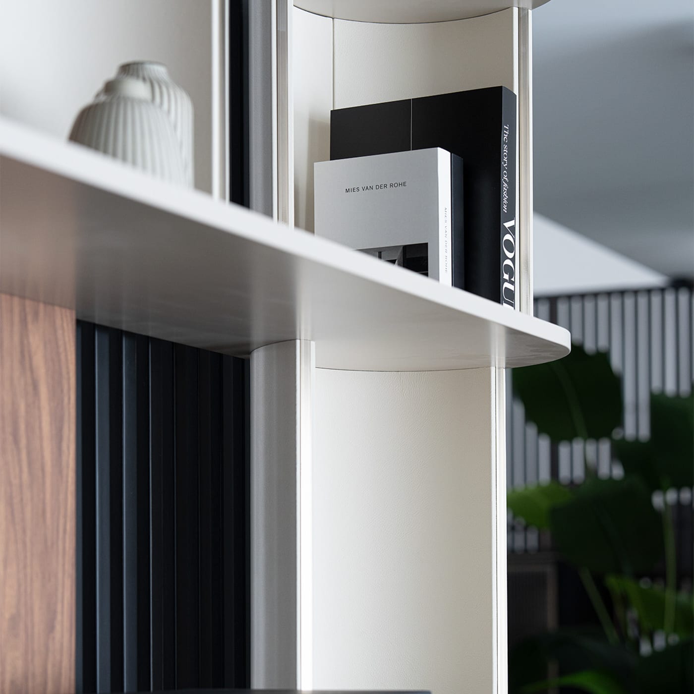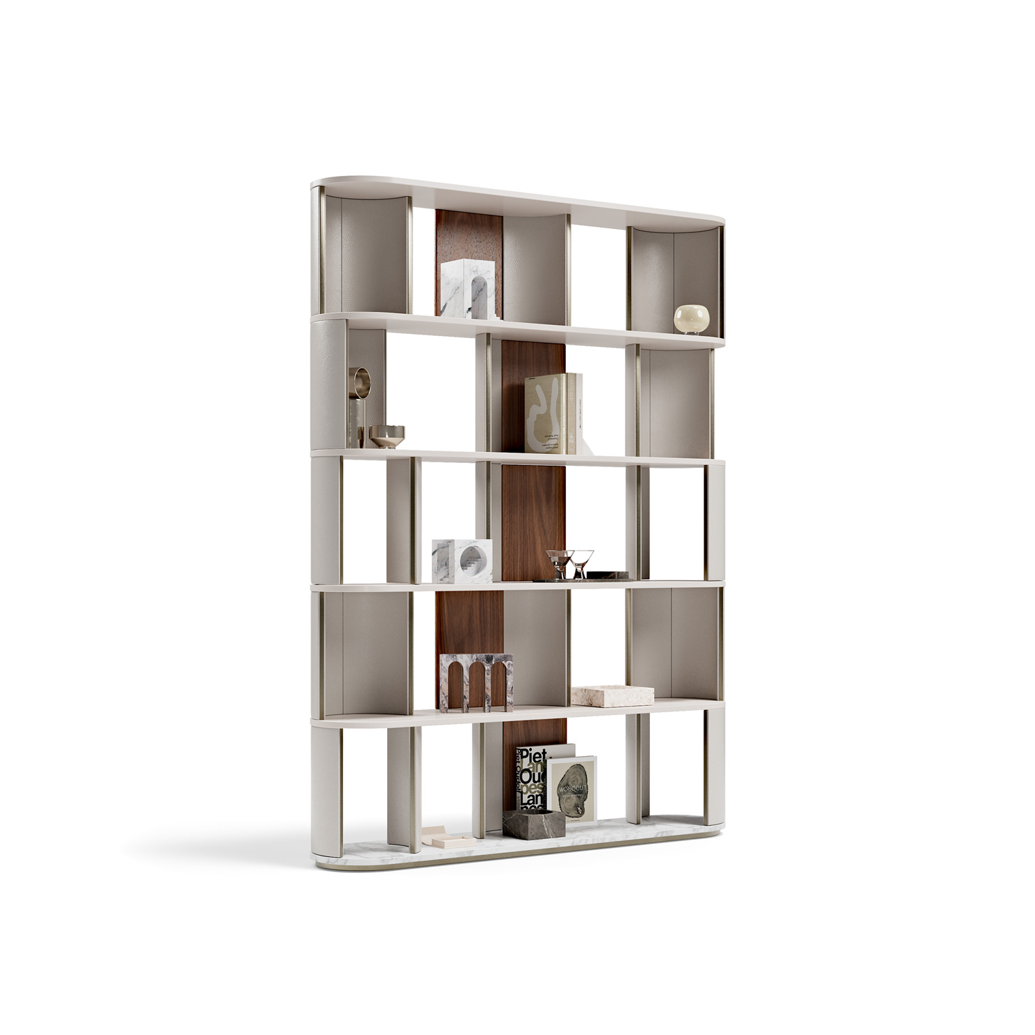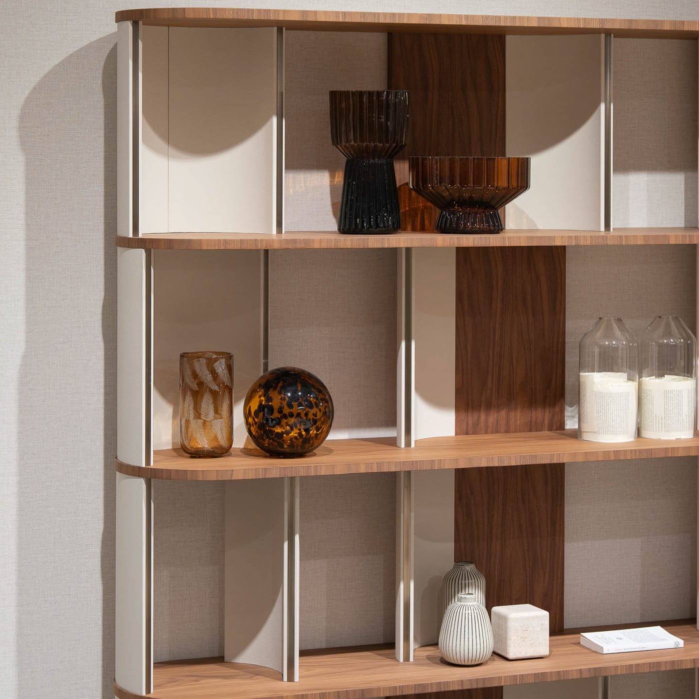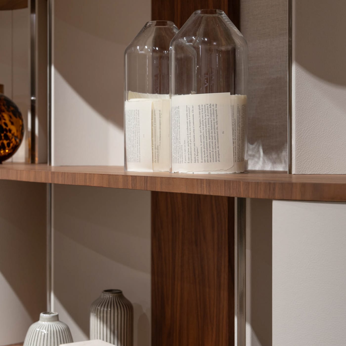 Sipario is built on a wooden structure, giving the bookcase a solid, reassuring core. The base can be specified in matching wood, in a lacquered finish for a crisper look, or in marble when a more grounded, mineral note is desired. Back panels and shelves are offered either in wood essence or lacquer, allowing the client to decide how quiet or how graphic the overall composition should feel. The curved panels are upholstered exclusively in plain leather, Cat. A or Cat. B, which keeps the look refined and avoids visual noise.