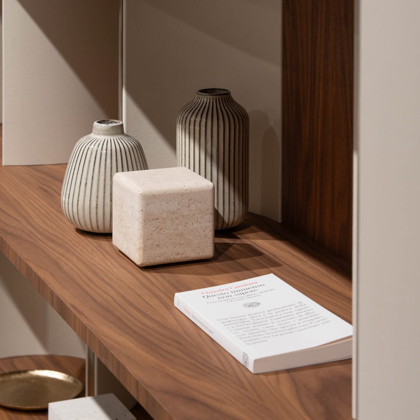 With a volume of about 42.4 cubic feet, the Sipario bookcase offers substantial storage while still reading as a single, coherent object. Against a wall, it becomes a calm backdrop for books, art, and collected objects. In a larger space, it can also help define areas without fully closing them off, thanks to its open structure and slim depth. In a living room, study, or private office, the piece introduces order and warmth rather than a strictly functional storage grid.