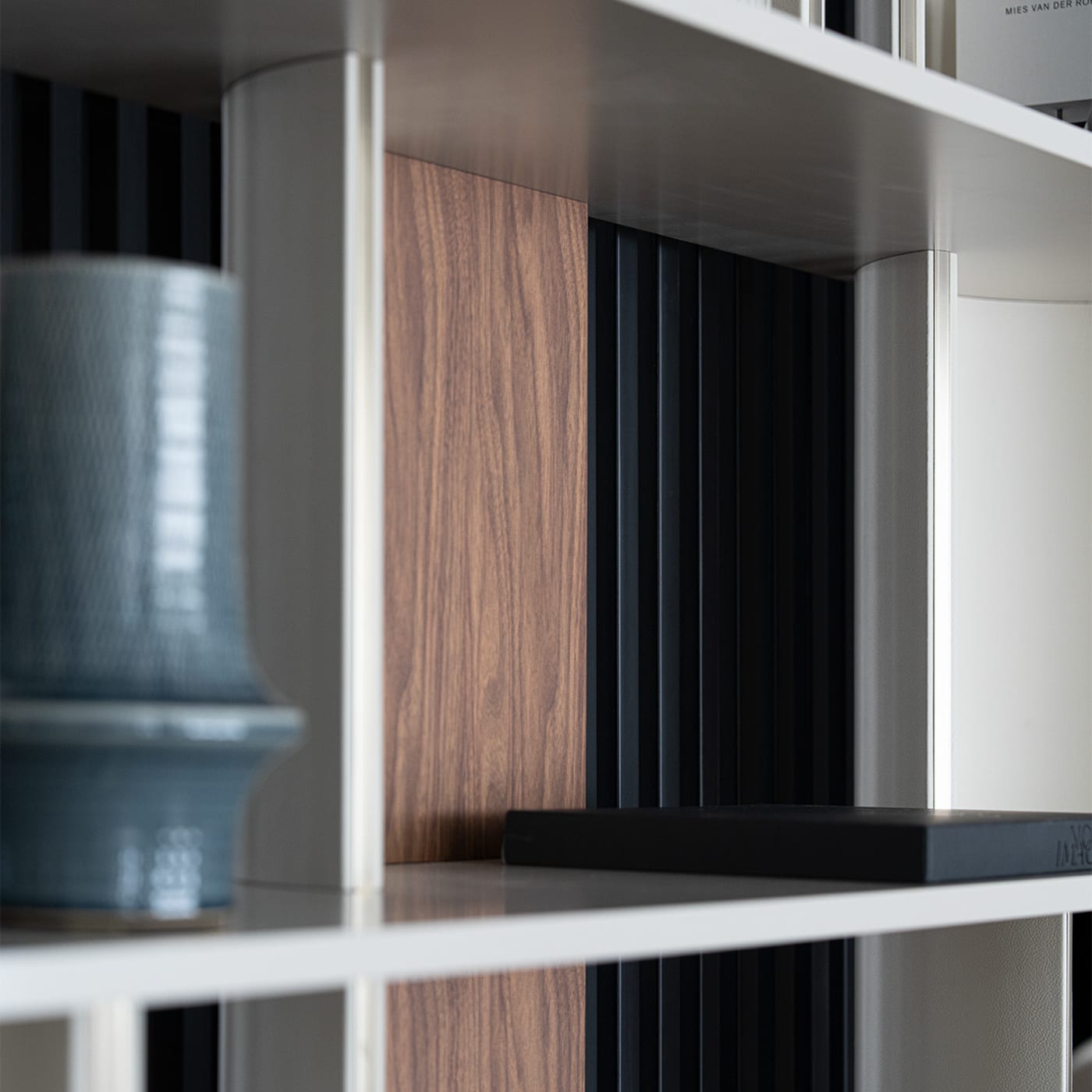 This is a bookcase meant to be lived with, not just looked at. The depth is practical, keeping books and objects easy to reach without projecting too far into the room. Shelves and panels create natural zones for display, storage, and a bit of concealment, so everyday items can sit alongside more curated pieces without the whole composition feeling busy. Visual comfort comes from that balance: open, closed, and curved elements working together quietly.