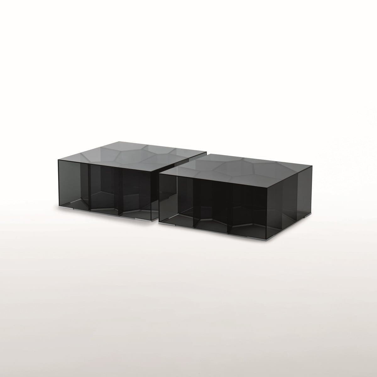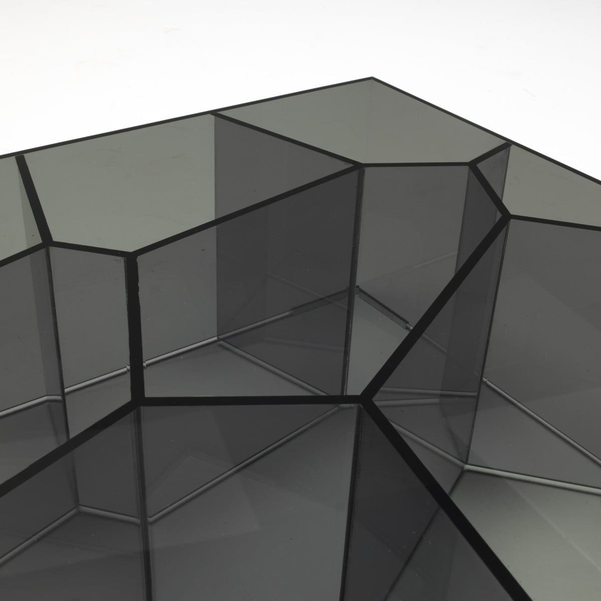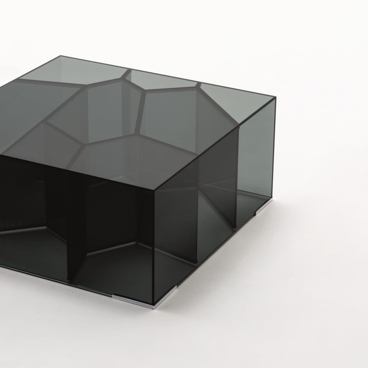The table is made in 6 mm tempered smoked glass, glued at 45° for crisp corners and a continuous line. Inside, a complex honeycomb structure sits within the volume. It adds visual depth through the tinted glass, so the table never feels flat or purely minimal.