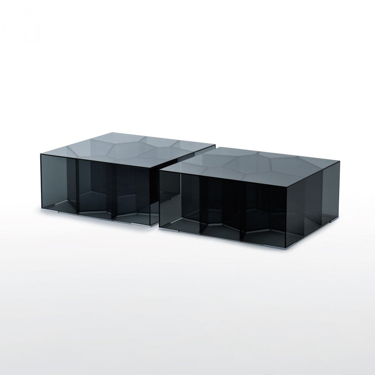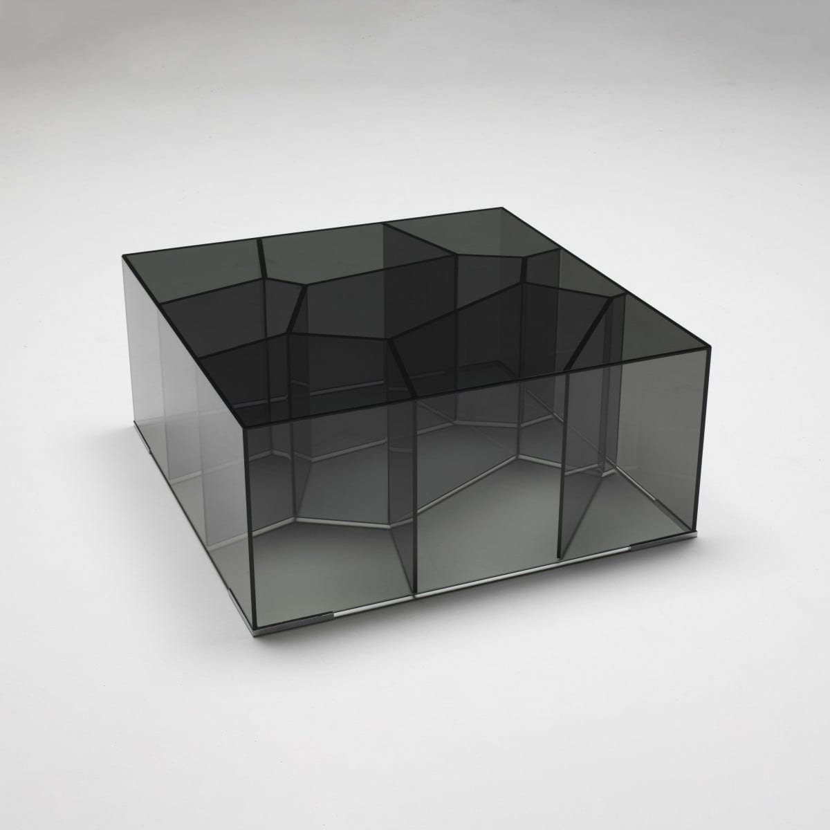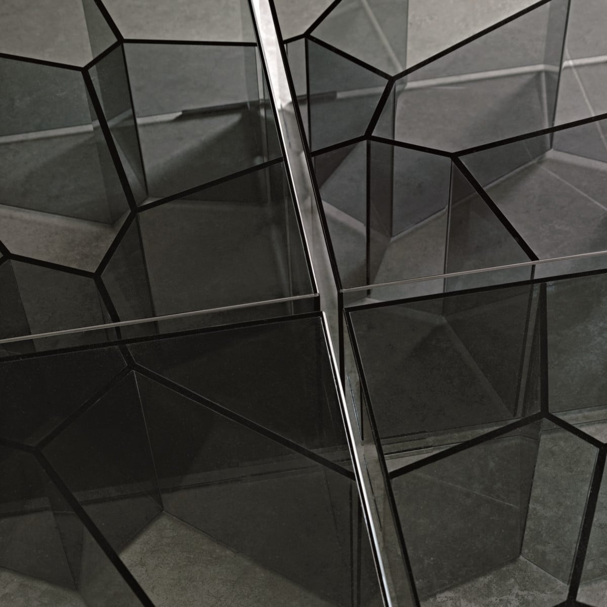 The table is made in 6 mm tempered smoked glass, glued at 45° for crisp corners and a continuous line. Inside, a complex honeycomb structure sits within the volume. It adds visual depth through the tinted glass, so the table never feels flat or purely minimal.