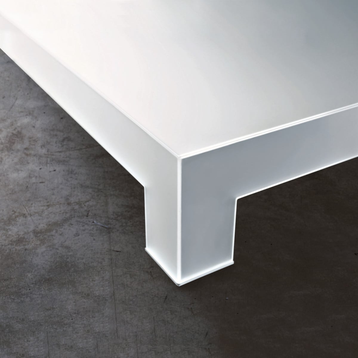 Designed by Lorenzo Arosio, the collection is offered in several square and rectangular formats, all set at the same low height. The profile stays consistent, so the choice comes down to footprint and how the table will live with seating.