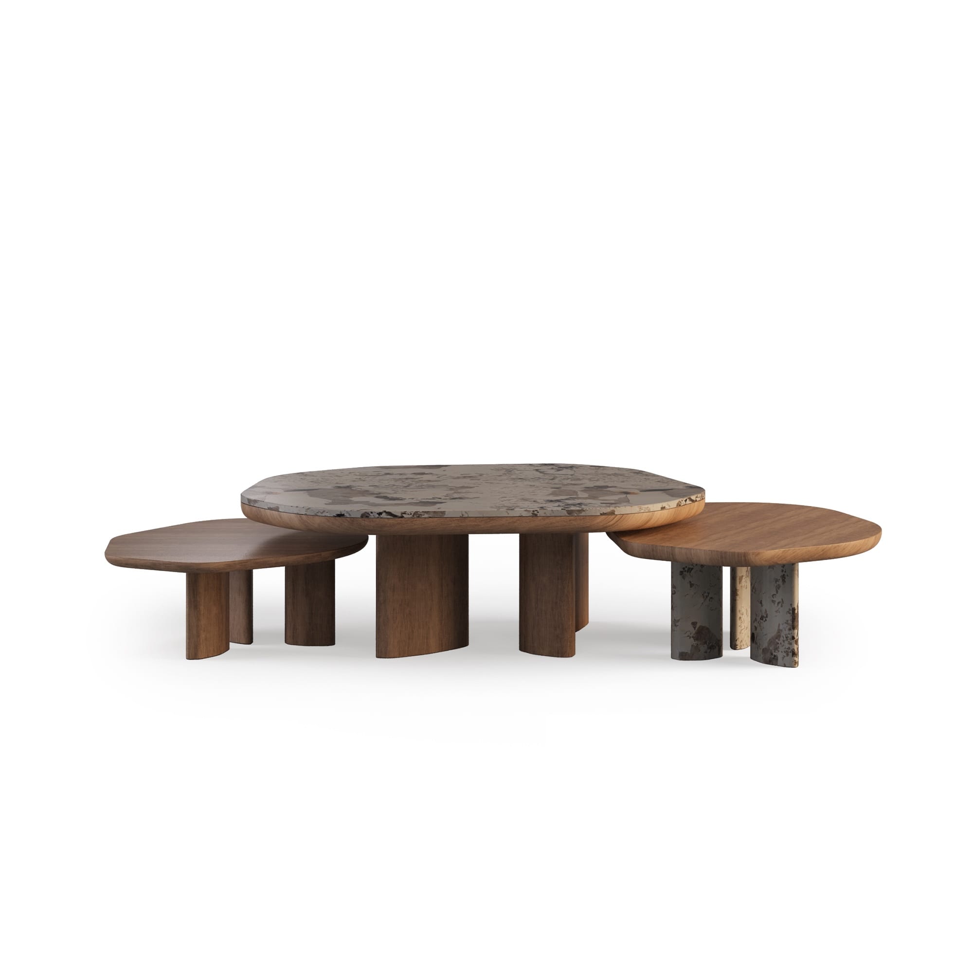 The standard Aty Coffee Table collection balances warm wood with cool stone. The small table is made in iroko, while the medium and big tables pair iroko with a marble top. The mix is intentional: the wood brings depth and natural character, and the marble adds a crisp surface that catches light differently throughout the day.