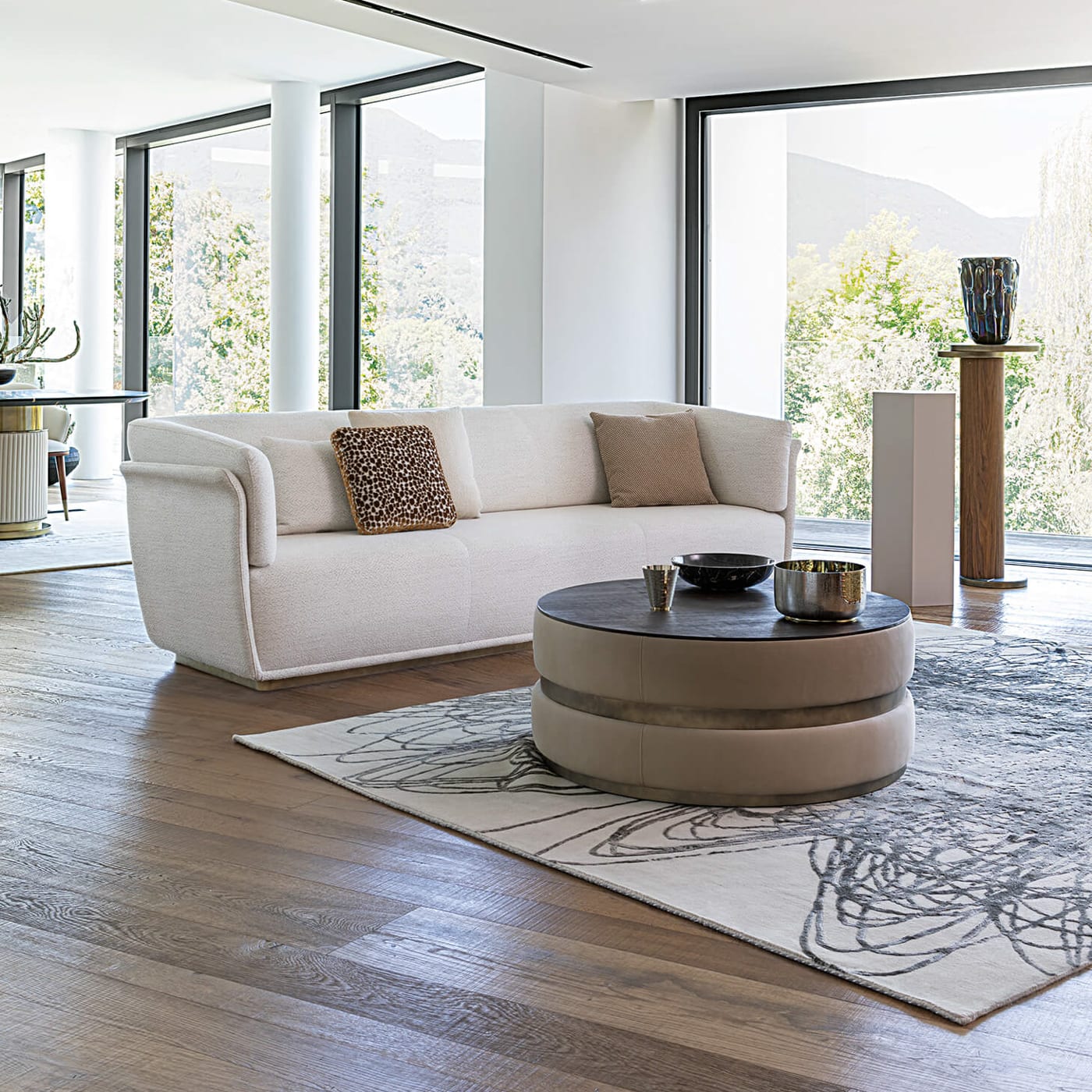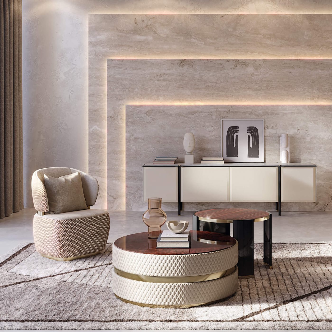 Designed in 2019 by Boatto Martino Studio for the Capital coffee tables collection, Cookie works as a central piece in a lounge setting or as a generous service table in a larger room. The combination of an upholstered base with either marble or wood top lets it adapt to different interiors, from pared-back spaces to more layered environments. And because it is finished on all sides, it sits well both in the middle of a room and closer to a wall.